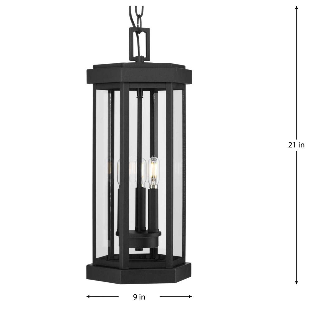 The hanging lantern is coated in a textured black finish, highlighting the frame's distinct silhouette