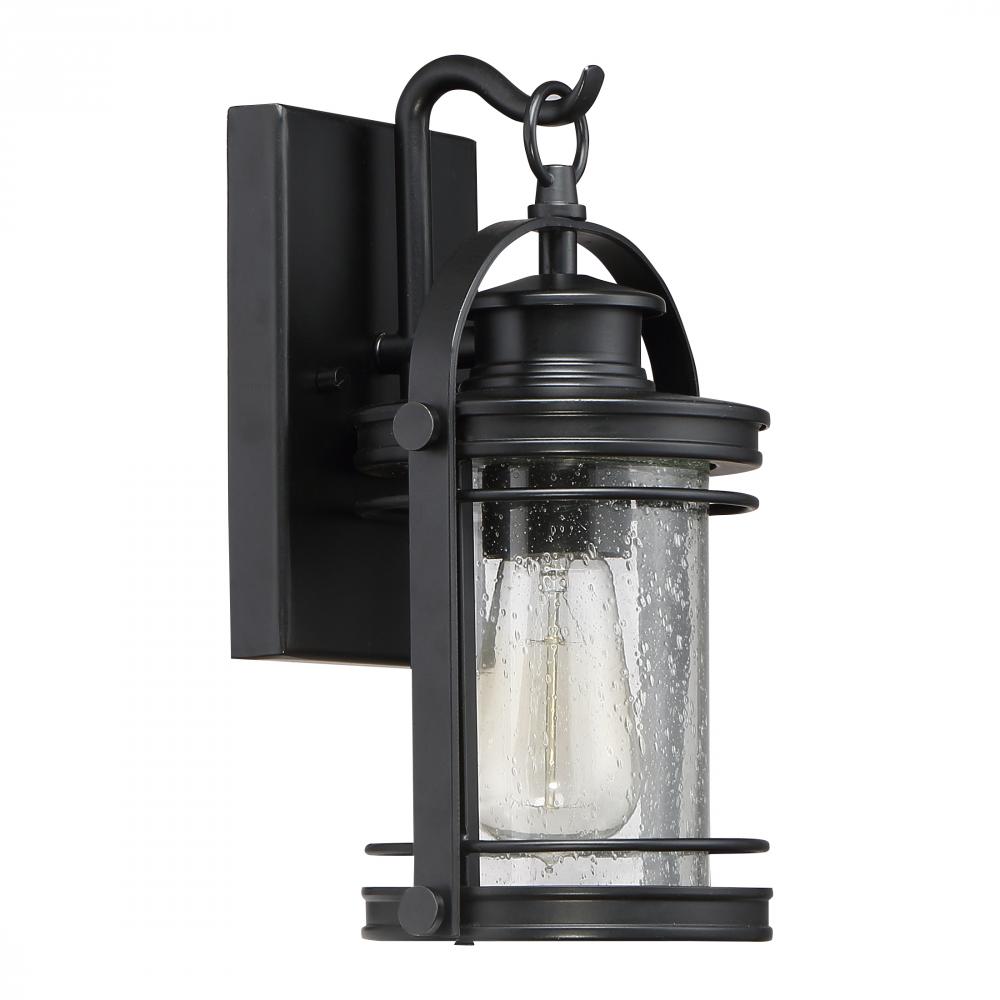 The Booker Outdoor Collection is a fresh and charming style. The design features a curved arm on the backplate “holding” the lantern and the finish is an inky Mystic Black. All of the details from the knobs, round trim and light seedy glass come toge