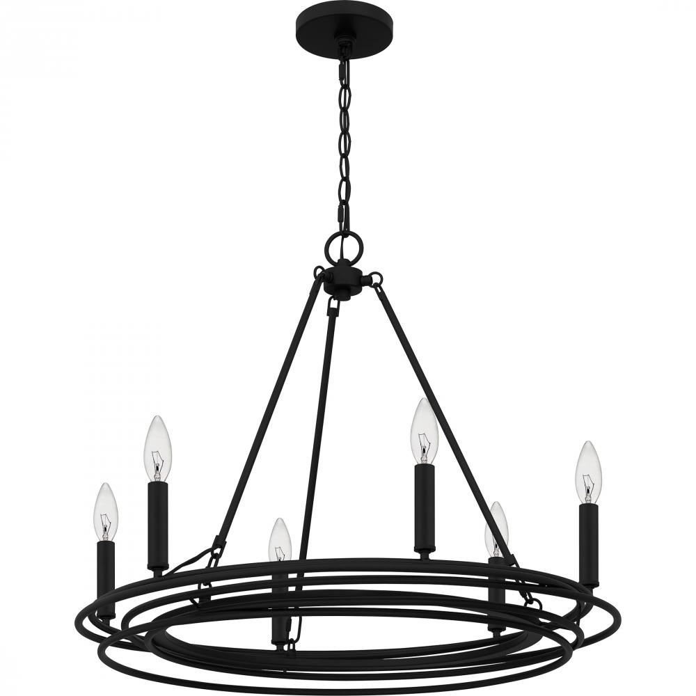 Calliope makes a bold industrial statement with its sculptural, geometric design. Matte black rings of different sizes encircle the round silhouette for a unique spiraling effect. Choose from a flush mount light with hammered etched glass or a candle-style