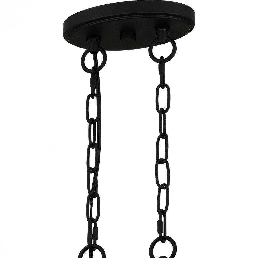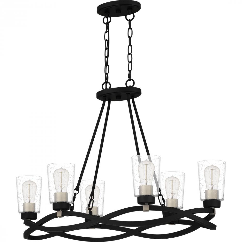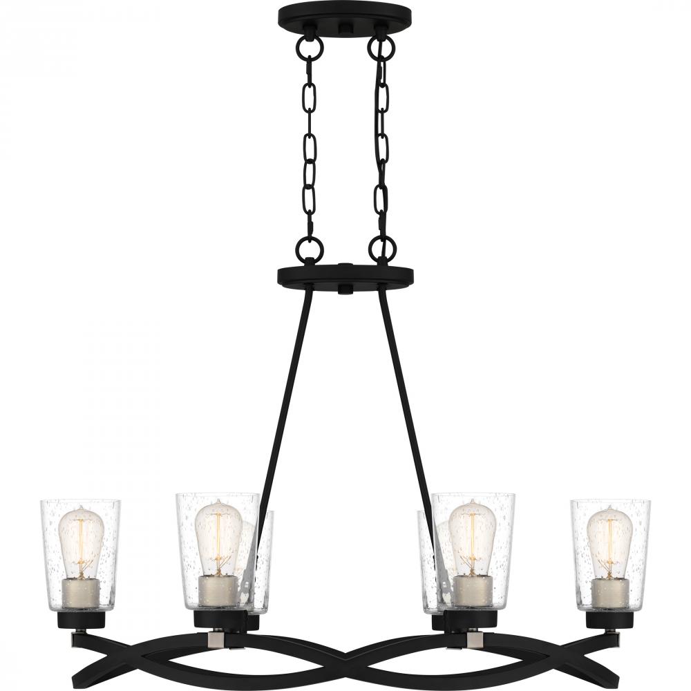 Available as an island light or chandelier, Overlook features a pretty, plaited wreath base rendered in earth black. Seeded glass shades scatter light throughout a dining or kitchen space. The Overlook light features nods to traditional design cues: a clas