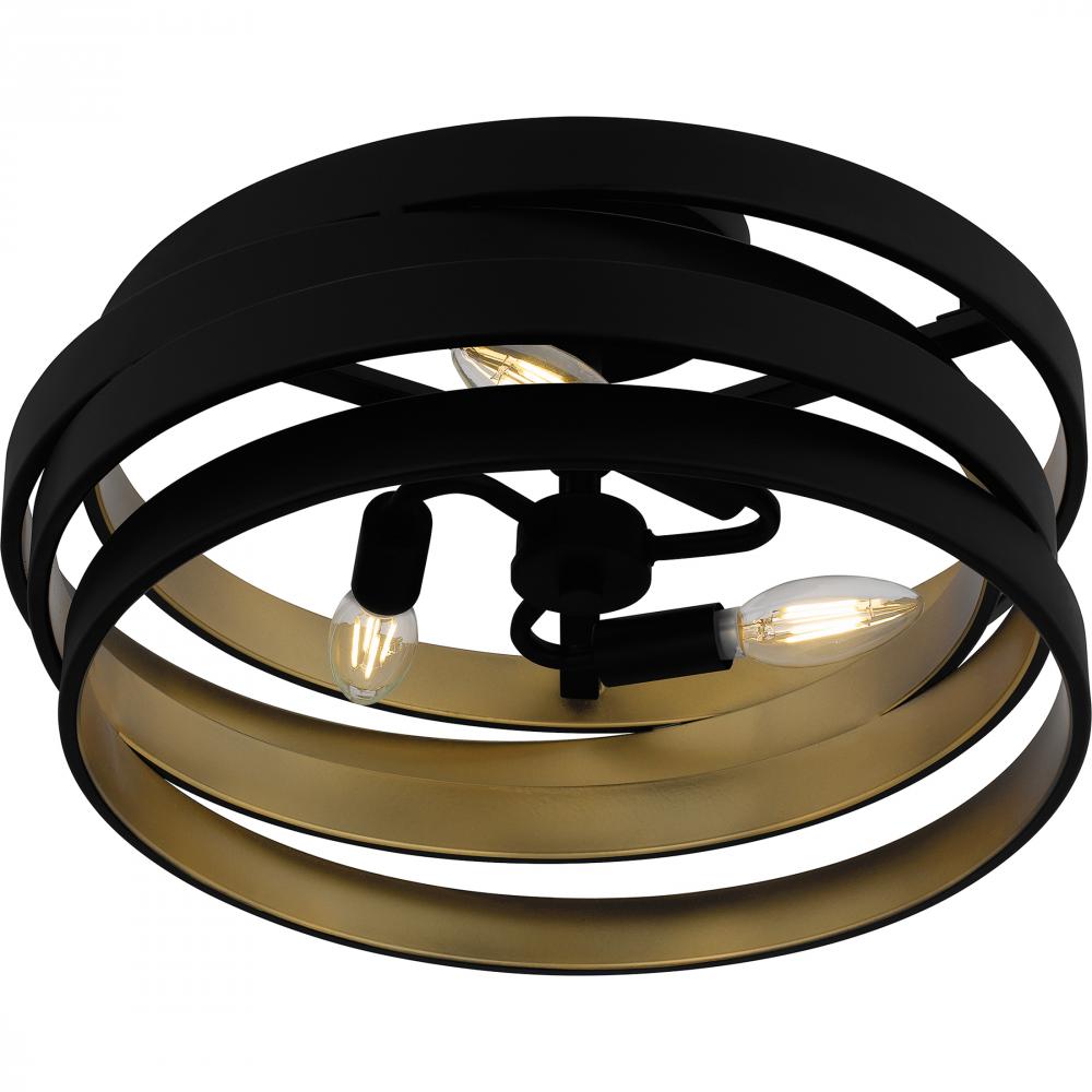 Matte black and gold make a beautiful, modern industrial pairing in Berner. The semi-flush mount light features a geometric silhouette with concentric black metal bands, painted gold on the inside for a pop of shine. Hang this versatile design in a range o