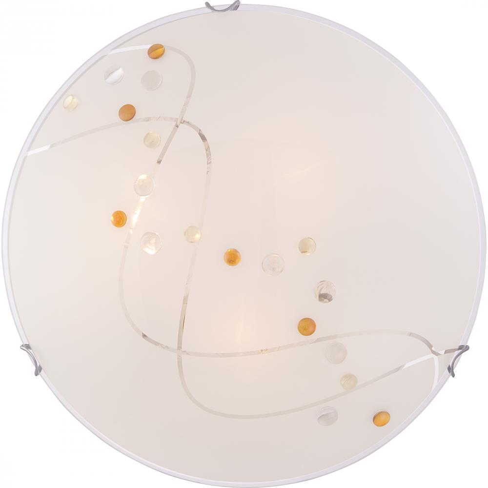 Stellar from the Quoizel Platinum Collection is a beautifully designed floating flush mount. The amber yellow and clear jewels on the shade bring life to the white painted glass and the intricate detail of the two clear swirling lines add a little twin
