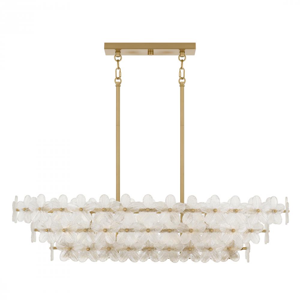 The Wright Collection is a celebration of whimsy and elegance. Each piece pairs a radiant brushed gold finish with delicate clear textured glass shaped like blooming petals, casting a soft, sparkling glow. Whether illuminating a dining room, entryway, or k