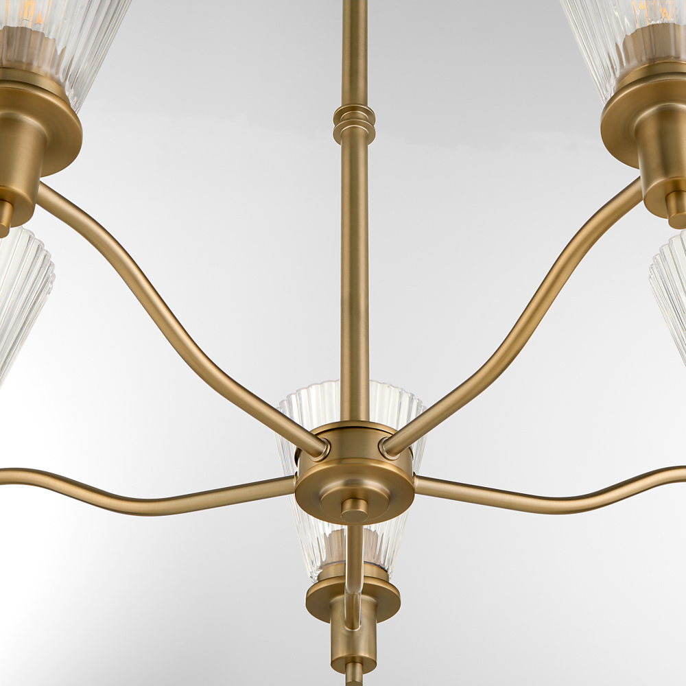 Lawton is a playful transitional series featuring pleated conical glass, ramped arms, and contemporary finishing. Early American and European styles inspired the clean bobeche, breaks, and steps in the details. Available in matte black or brushed brass, this chandelier offers versatility with 5 or 8 light options. Whether placed in living rooms, kitchens, or entryways, Lawton adds a welcoming touch to any décor.