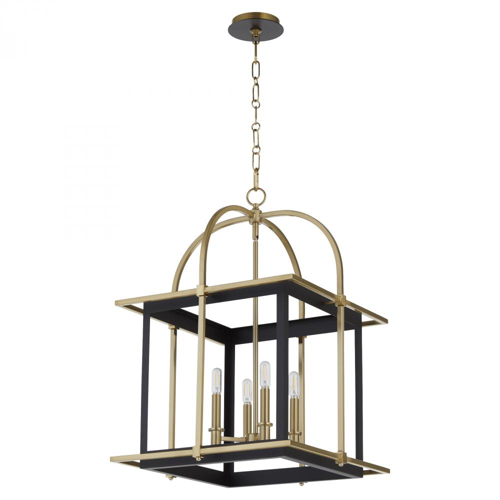 This Moritz lantern's design blends modern and traditional elements through a series of clean, angular lines accentuated by delicate, curved arches at the top. The combination of straight and curved lines creates a visually appealing and balanced look with a luxurious combination of aged brass and matte black finishes. The cubical frame supports the geometric aesthetic of the fixture, while four exposed candelabra sockets ensure ample illumination. Add a cohesive and polished look while creating a warm and inviting atmosphere with the Moritz lantern. Use in entryways, dining rooms, or living areas where a statement lighting fixture is desired.