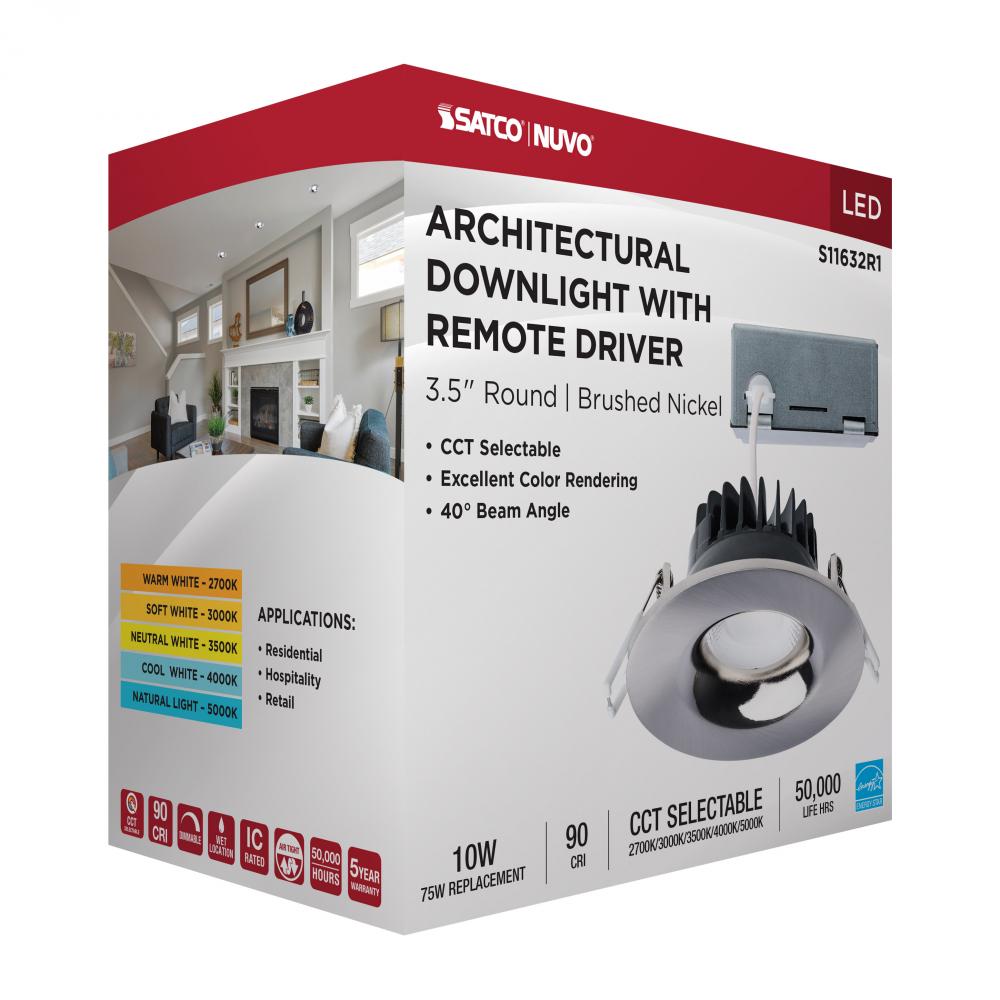 10 Watt LED Direct Wire Downlight; Remote Driver; CCT Selectable; Dimmable; Round; Brushed Nickel Finish