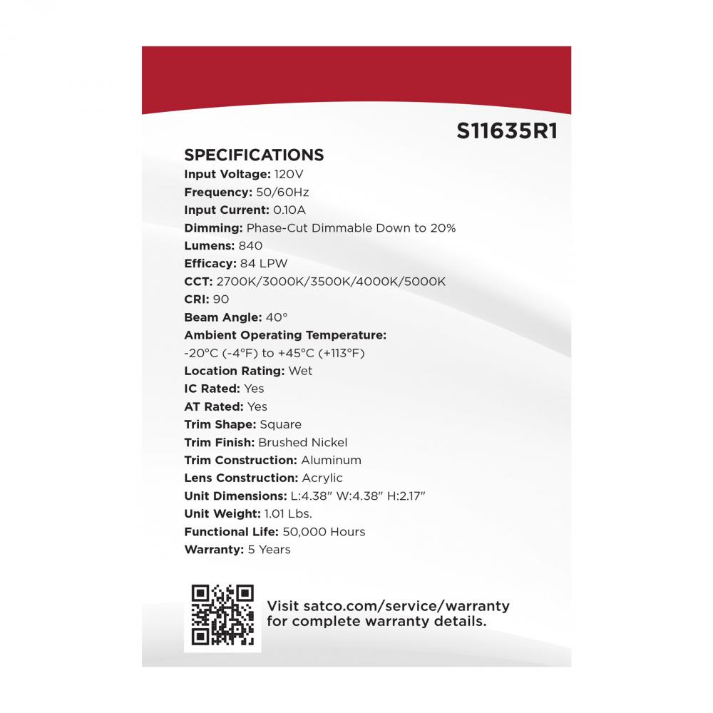10 Watt LED Direct Wire Downlight; Remote Driver; CCT Selectable; Dimmable; Square; Brushed Nickel