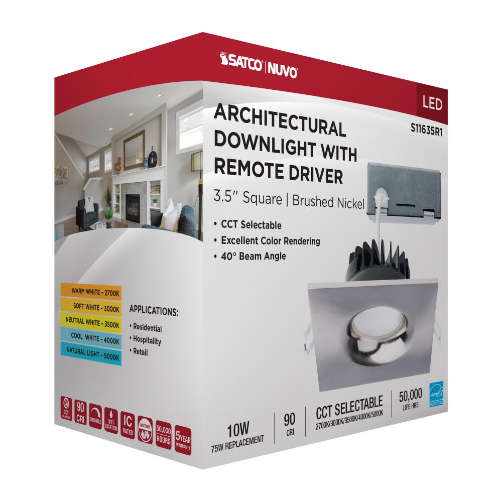 10 Watt LED Direct Wire Downlight; Remote Driver; CCT Selectable; Dimmable; Square; Brushed Nickel Finish