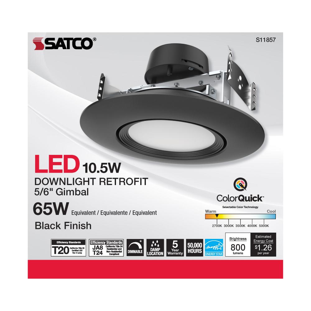 Satco's S11857 10.5 watt gimbaled LED downlight is a sleek lighting solution for residential and commercial applications. Illuminate kitchens, dining rooms, and office spaces with this CCT selectable fixture. Versatile and functional, this black trimme