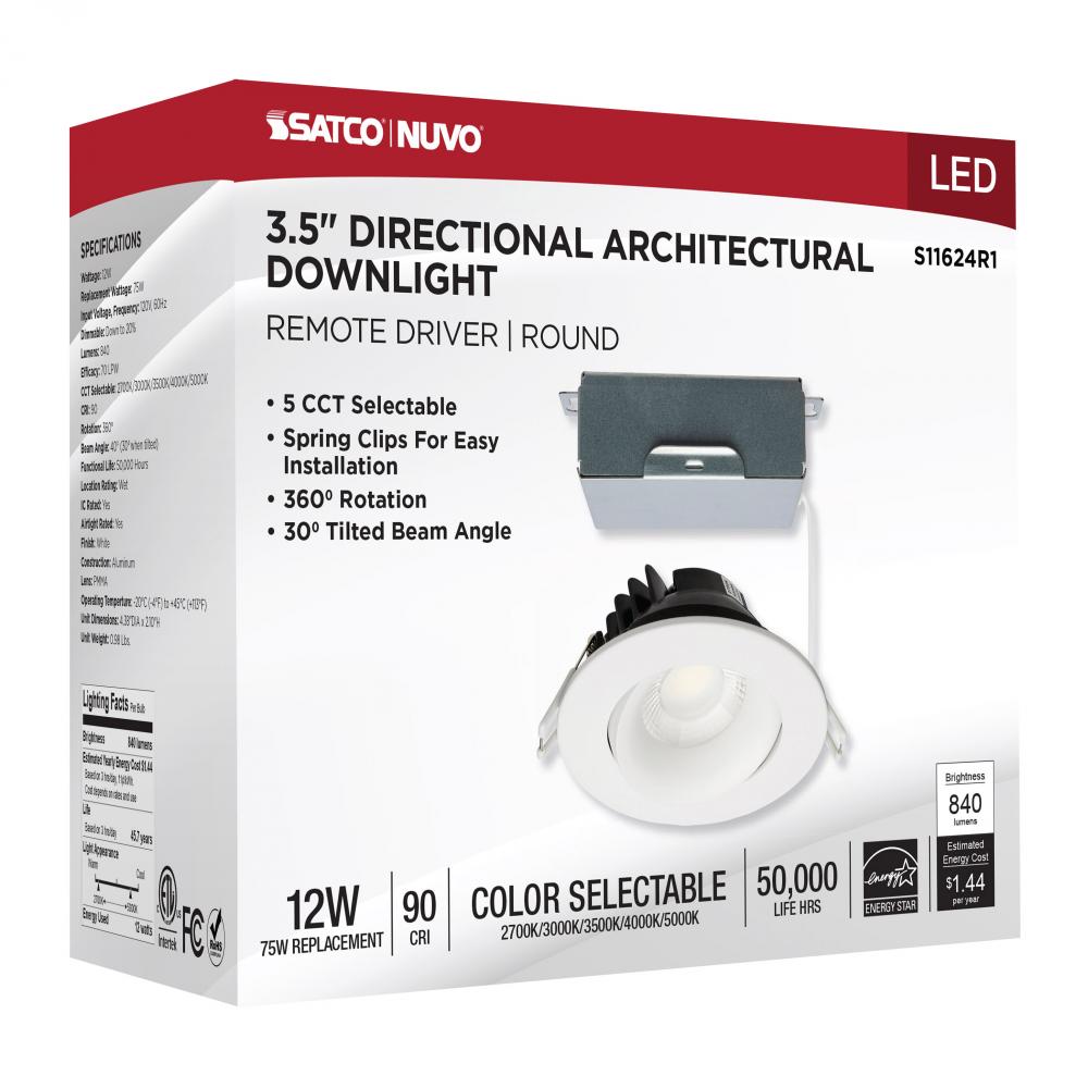12 Watt LED Direct Wire Downlight; Gimbaled; 3.5 Inch; CCT Selectable; Round; Remote Driver; White Finish; 840 Lumens; 120 Volt