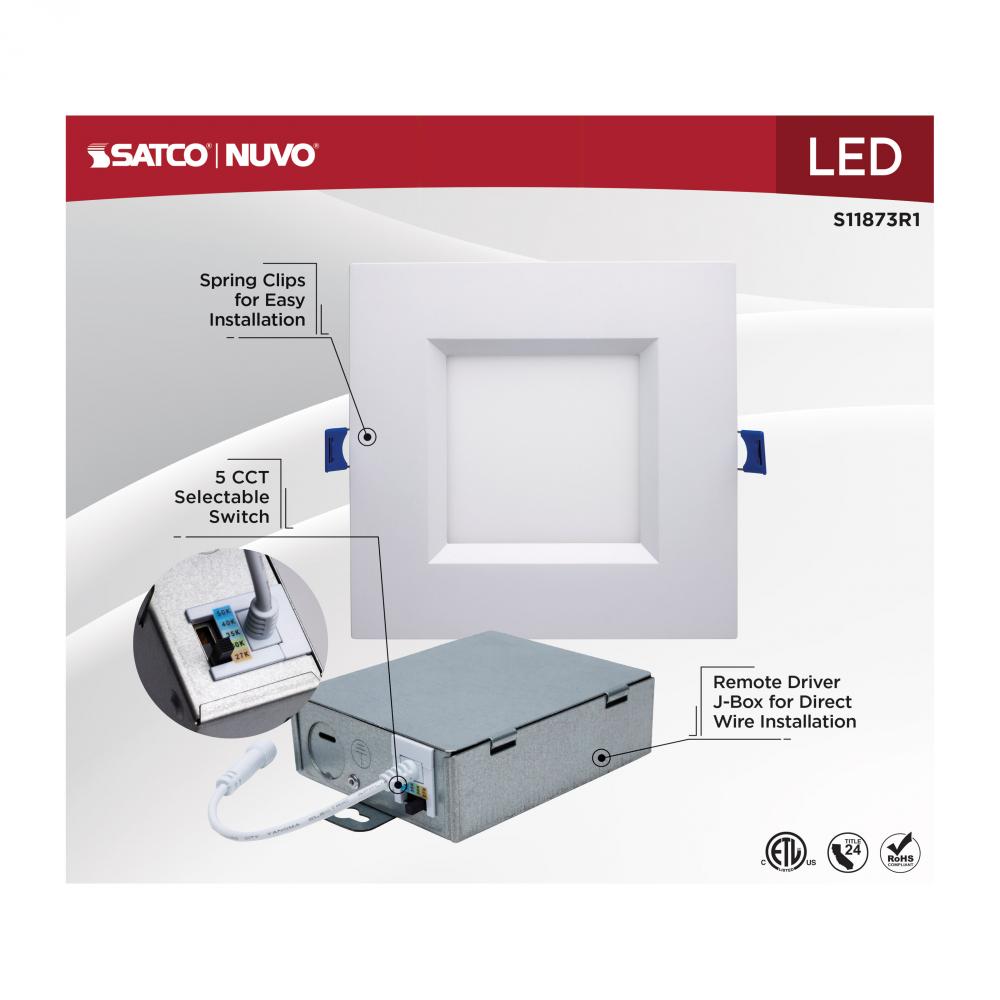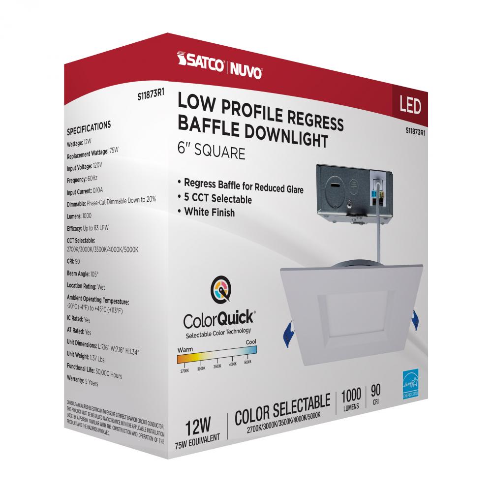 SATCO NUVO's low-profile 6" square regress baffle downlight, S11873R1, combines performance, versatility, and ease of installation. It features 5 CCT selectable settings (2700K–5000K) to accommodate a wide range of lighting preferences, while the