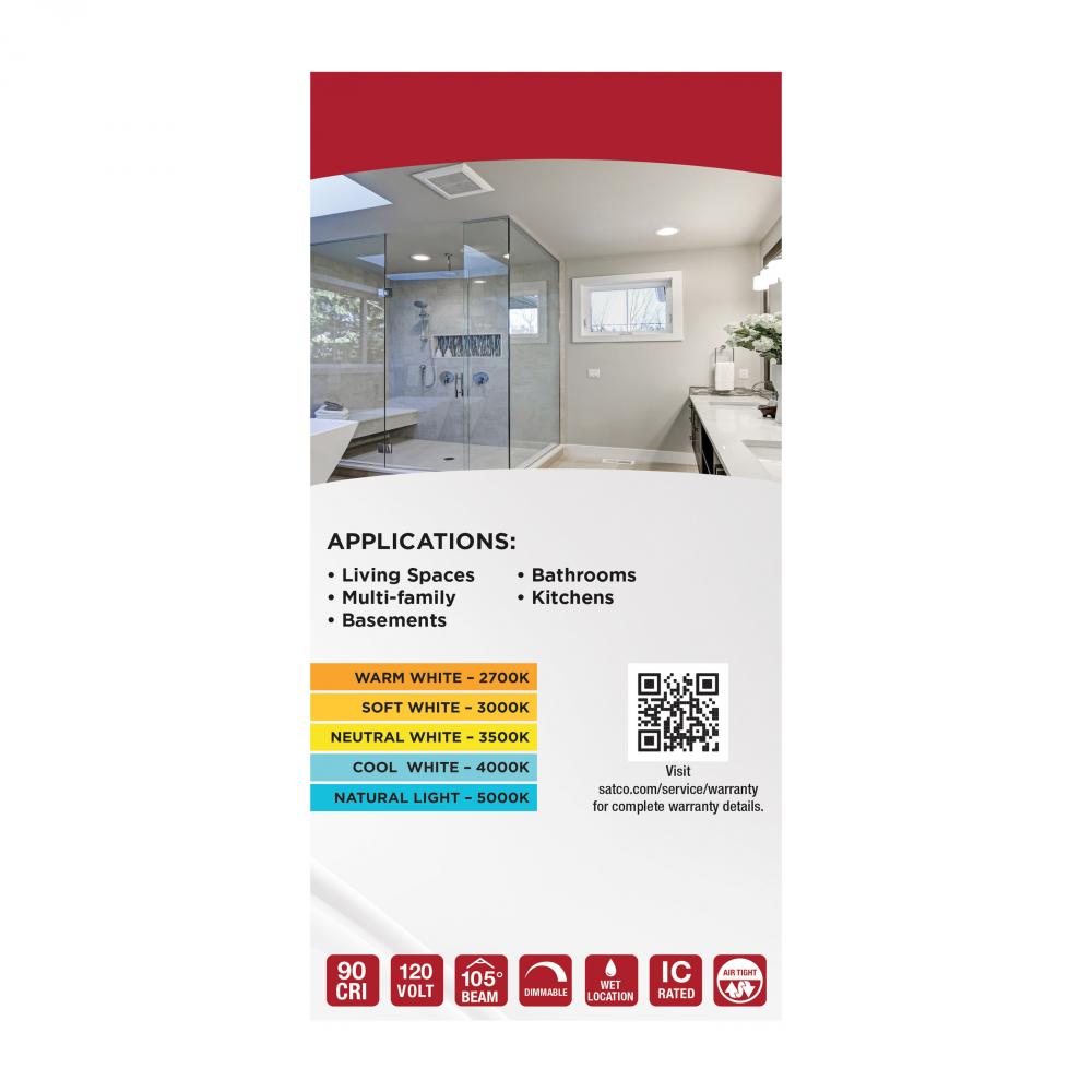 SATCO NUVO's low-profile regress baffle downlights combine performance, versatility, and ease of installation. Available in 4" and 6" sizes with both round and square trim options, they feature 5 CCT selectable settings (2700K–5000K) to accom