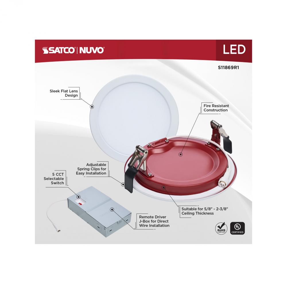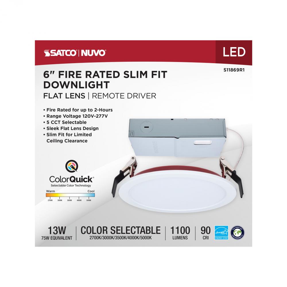 13 Watt LED; Fire Rated 6 Inch; Direct Wire Slim Fit Flat Face Downlight; Round Shape; White Finish; CCT Selectable; 120-277 Volts; 0-10V Dimmable