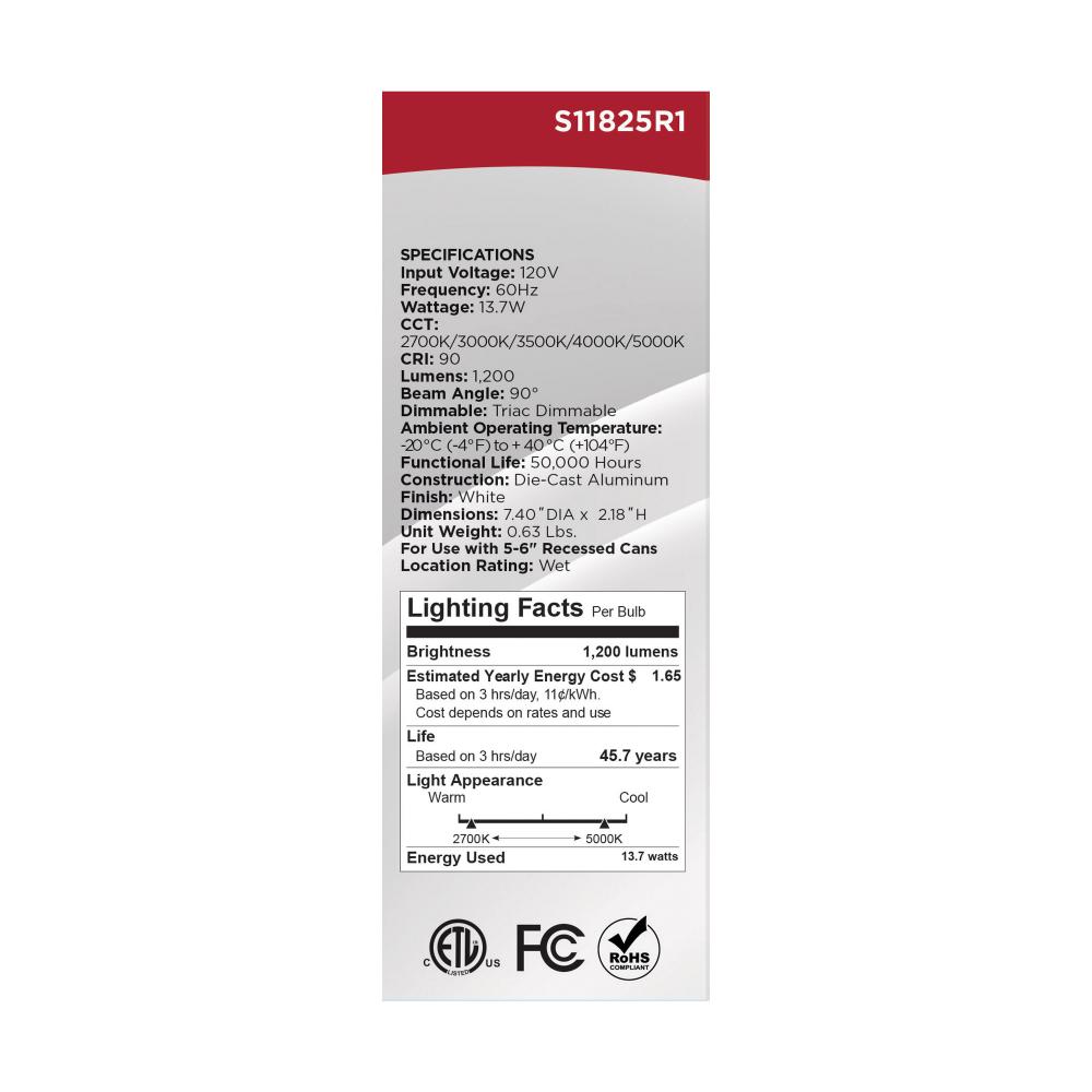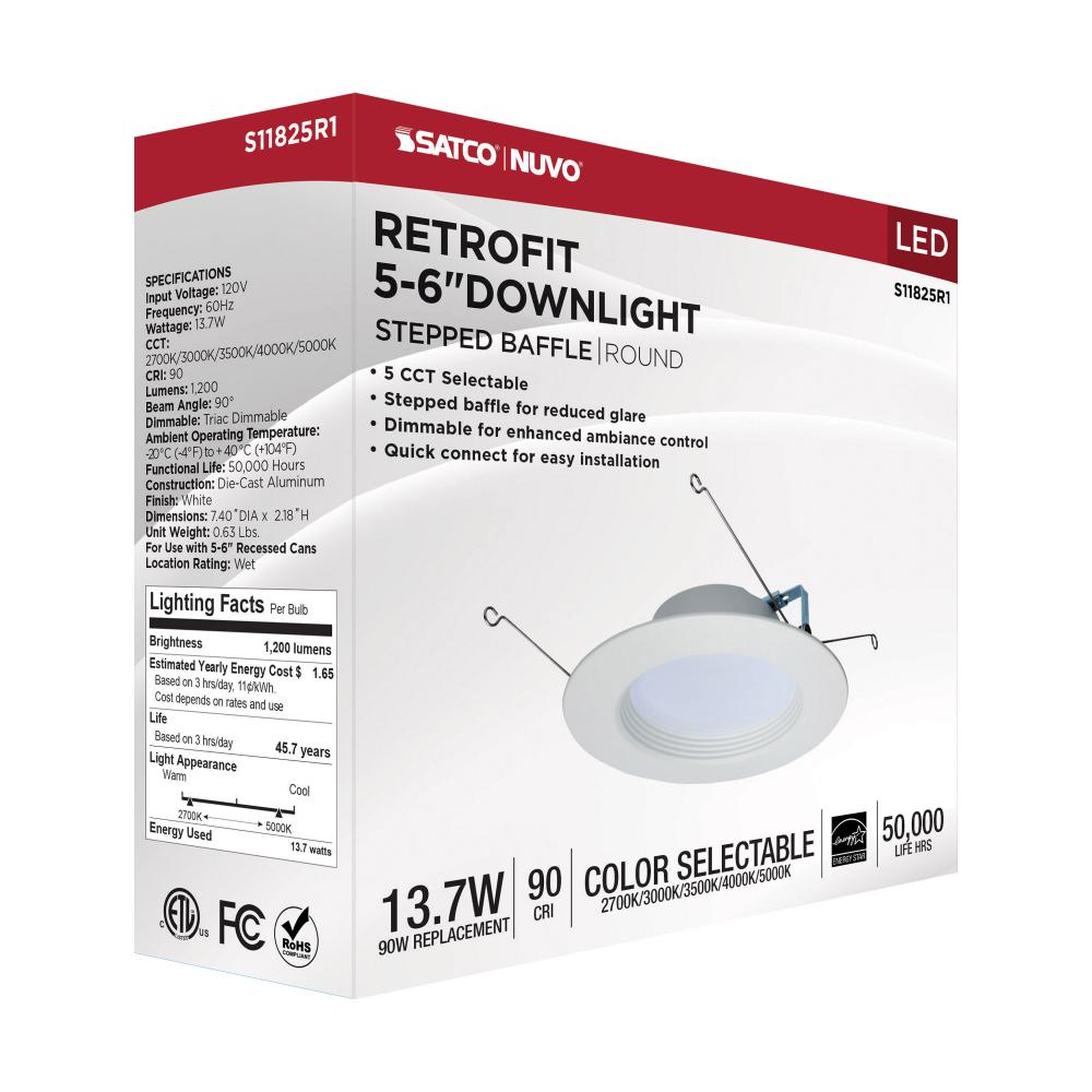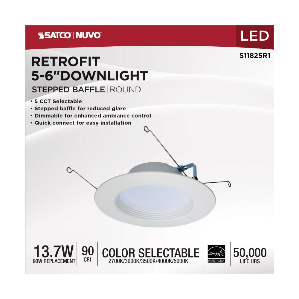 13.7 Watt LED Downlight Retrofit; 5-6 Inches; CCT Selectable; Round; White Finish; 120 Volt