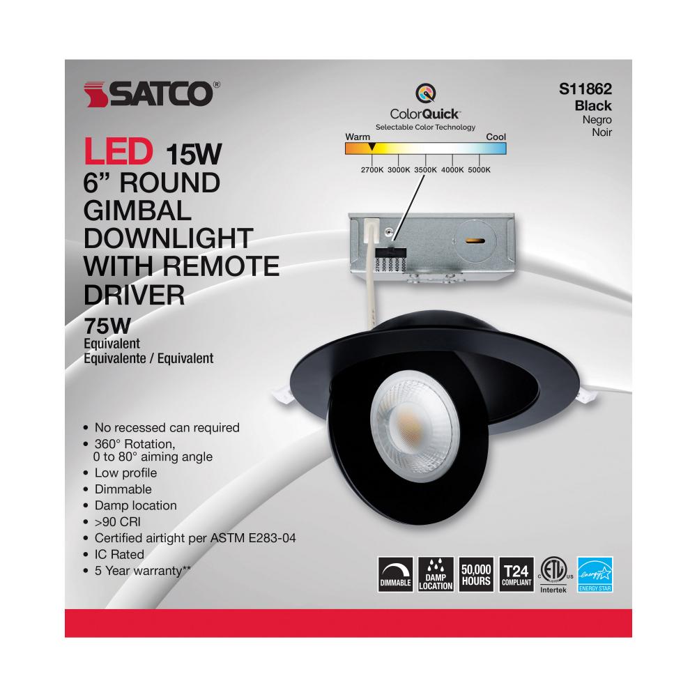 The black, six inch round, Satco S11862 gimbaled downlight delivers multiple advantages to any general recessed lighting project. Our ColorQuick technology allows the user to choose the color temperature from five different settings and brings the perfect