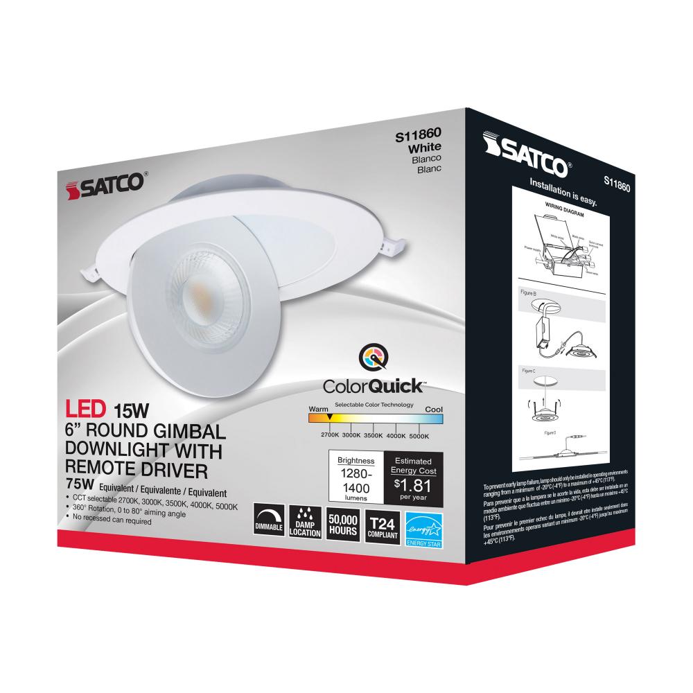 The white, six inch round, Satco S11860 gimbaled downlight delivers multiple advantages to any general recessed lighting project. Our ColorQuick technology allows the user to choose the color temperature from five different settings and brings the perfect