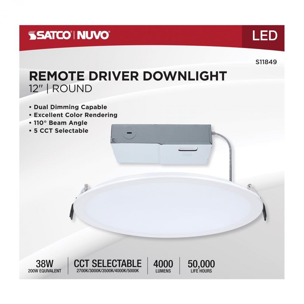 38 Watt; 12 Inch LED Direct Wire Downlight; Remote Driver; CCT Selectable; Dual Dimming; Flat Face; Round; White Finish