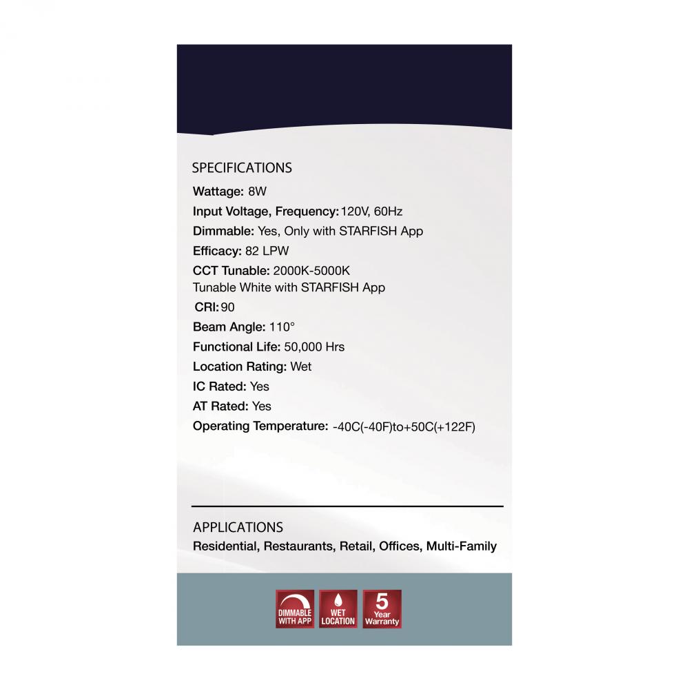 SATCO NUVO'S S11638 LED Retrofit Downlights with STARFISH technology are the ultimate choice for smart lighting and ambiance control. Download the STARFISH app to customize any tunable white color temperatures from 2000K warm white light to 5000K natur