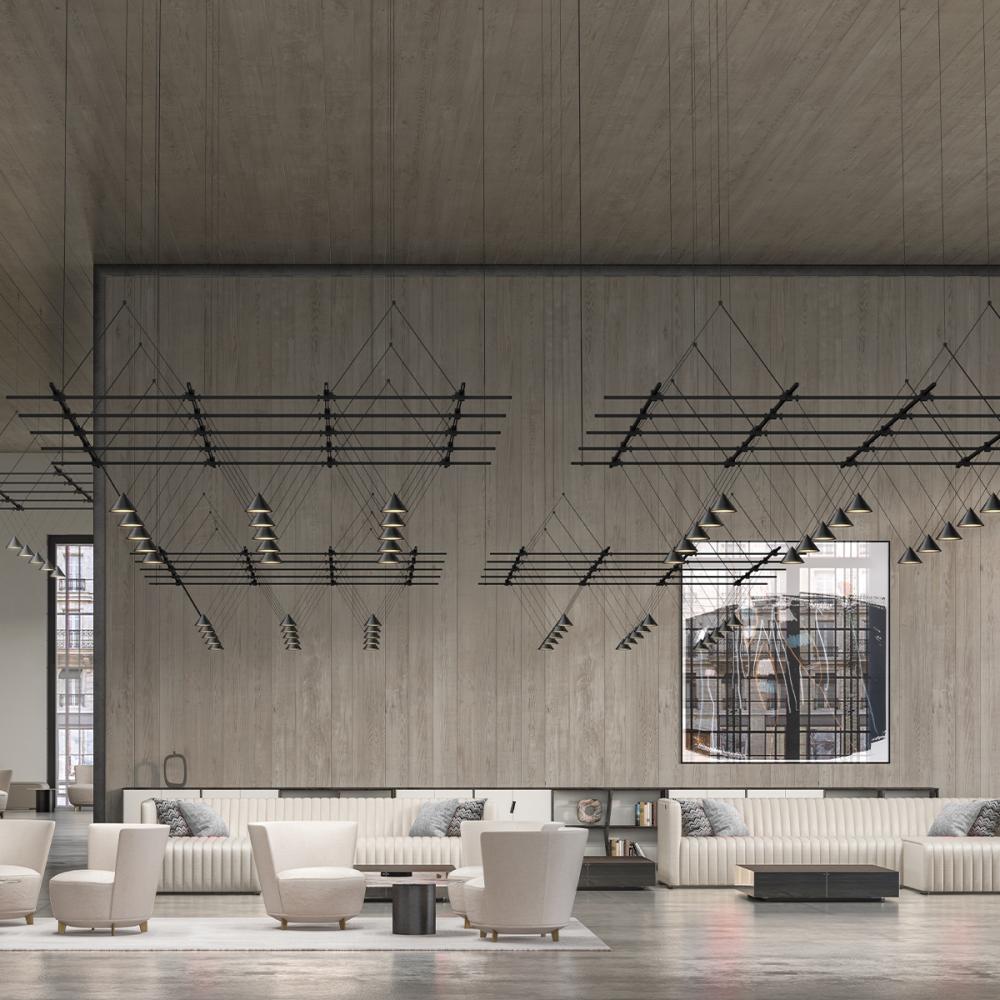 A series of Gridscape configurations are suspended from the apexes of triangular Truss Hangers, providing precise locations for the ceiling mounted supporting cables. V-line Downlight Cone Luminaires are suspended in perfect alignment to the Truss forms along the grid, establishing a rhythm and cadence of alignment along a centerline of the trusses and the cord-suspended Luminaires.