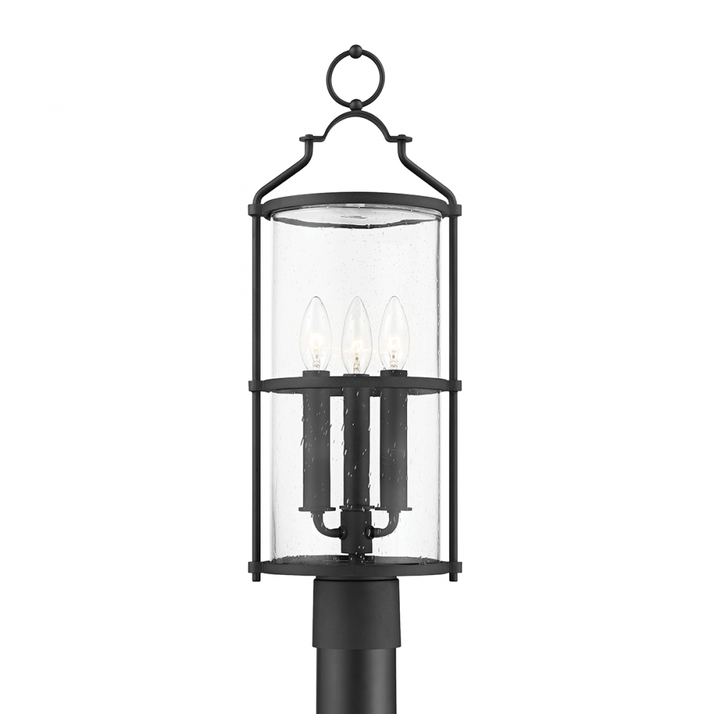 Romantic musings wash over Burbank, each delicate detail drawing the eye in. Clear seeded glass contrasts beautifully against an aluminum frame, topped with a decorative handle inspired by renaissance-era steeples. Available in an alluring textured black finish or weathered zinc. Available as a one, two, or three-light wall sconce, pendant, and post.