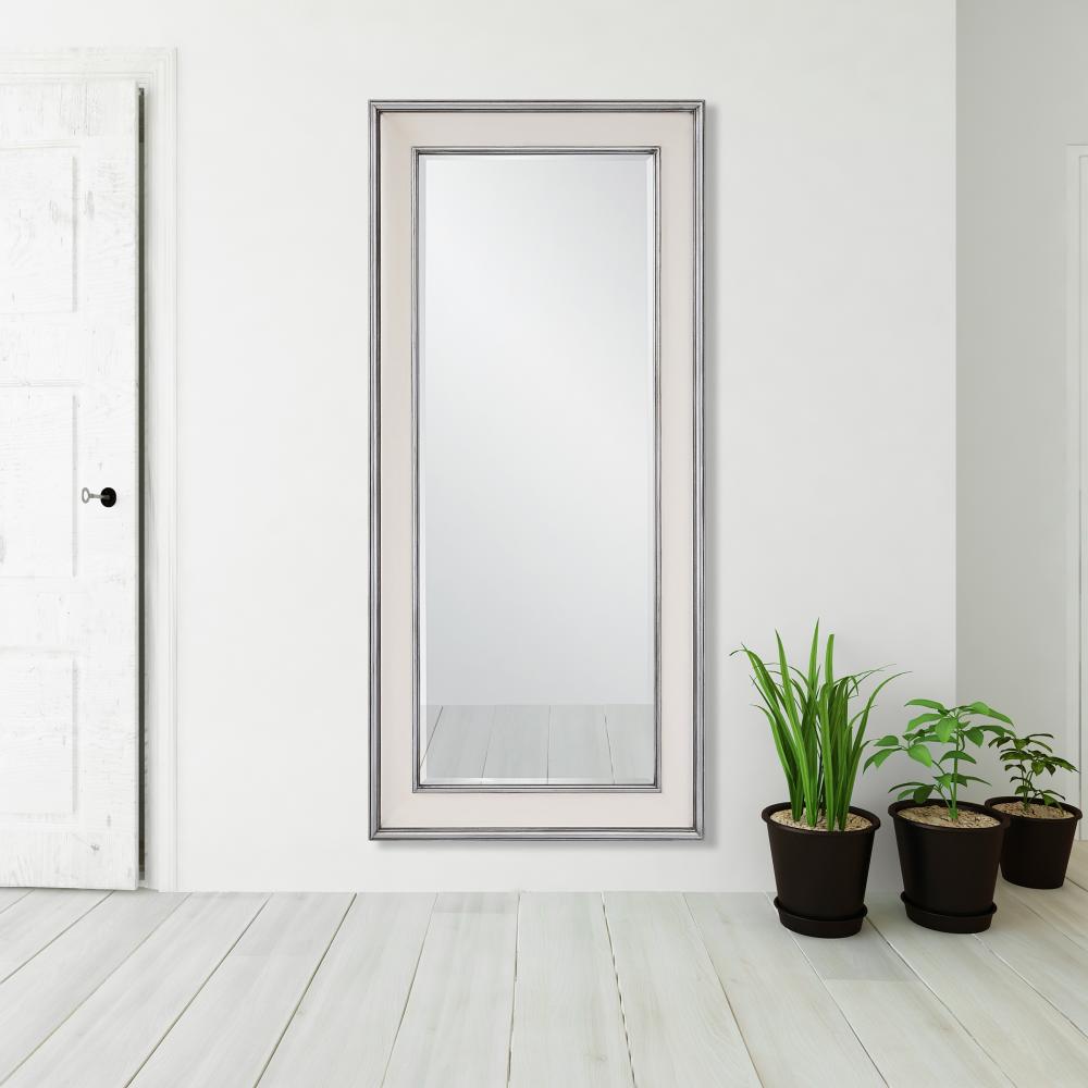 This 32" x 70" wood frame features a hand painted coconut milk white finish and silver detail. Mirror has a generous 1 1/4" bevel and may be hung horizontal or vertical.