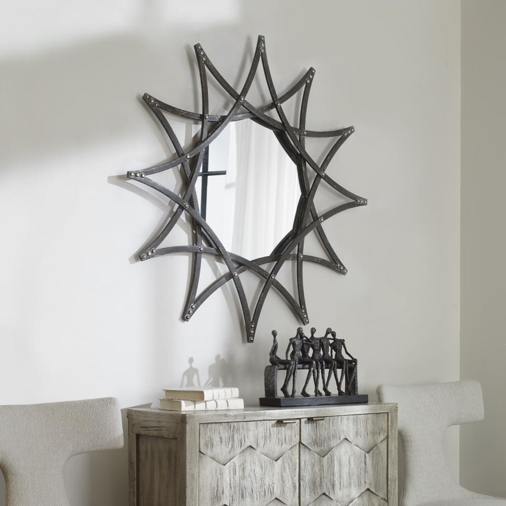 Handcrafted from forged iron, this mirror showcases a star-shaped frame finished in an aged crackled charcoal with a light gray glaze and antiqued silver rivet like accents.