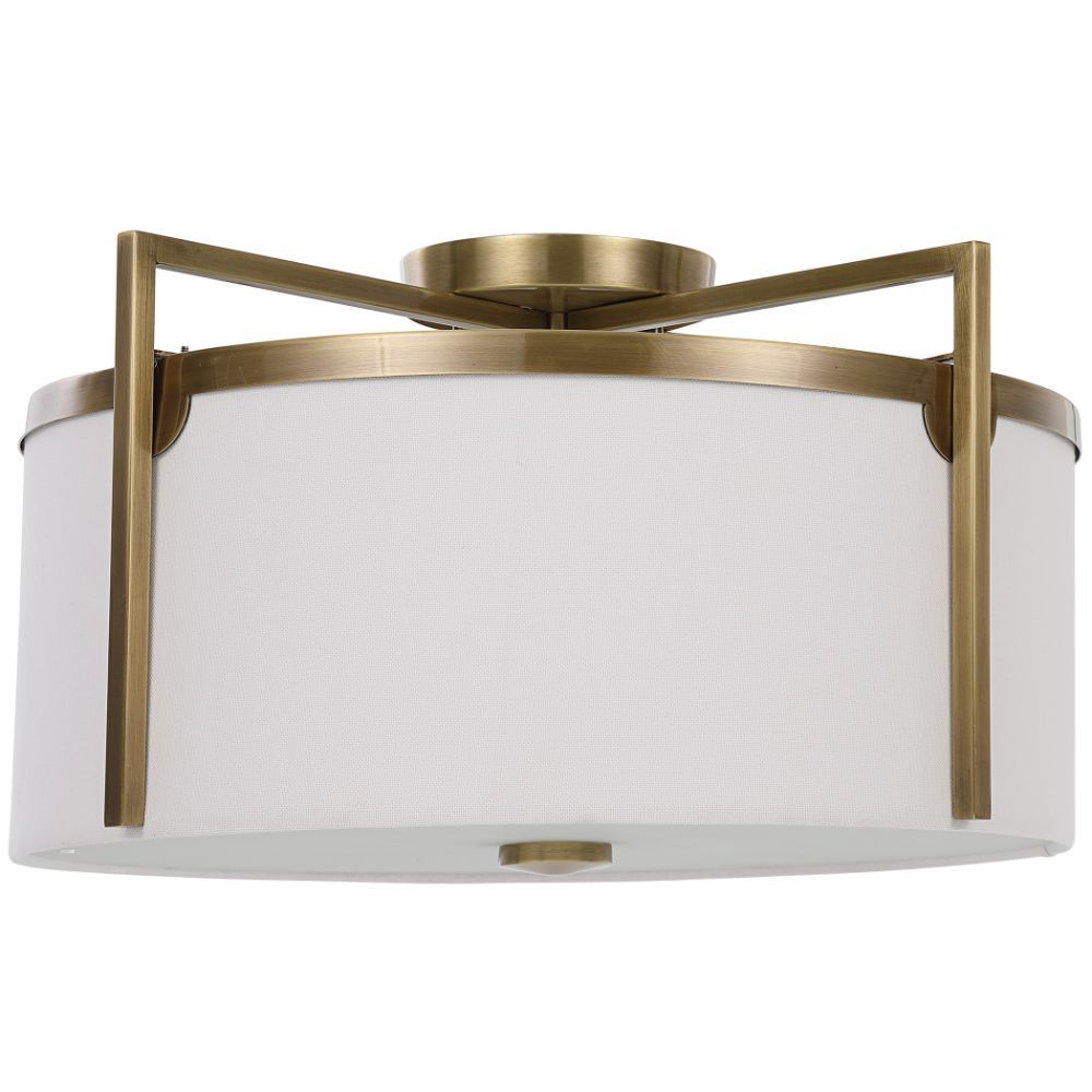 Chic and Versatile with Clean Lines This 3 Lt. Semi Flush Mount Features An Antique Brass Finish with Off-white Linen Hard Back Shade with A Central Frosted Glass Diffuser. 3-100 Watt Max, Edison Sockets. Bulbs Not Included.