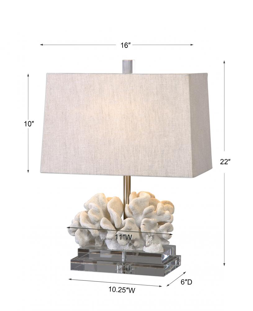 Taupe-ivory Coral Sculpture Accented with Thick Crystal Details. The Slightly Tapered Rectangle Hardback Shade is A Beige Linen Fabric with Natural Slubbing.