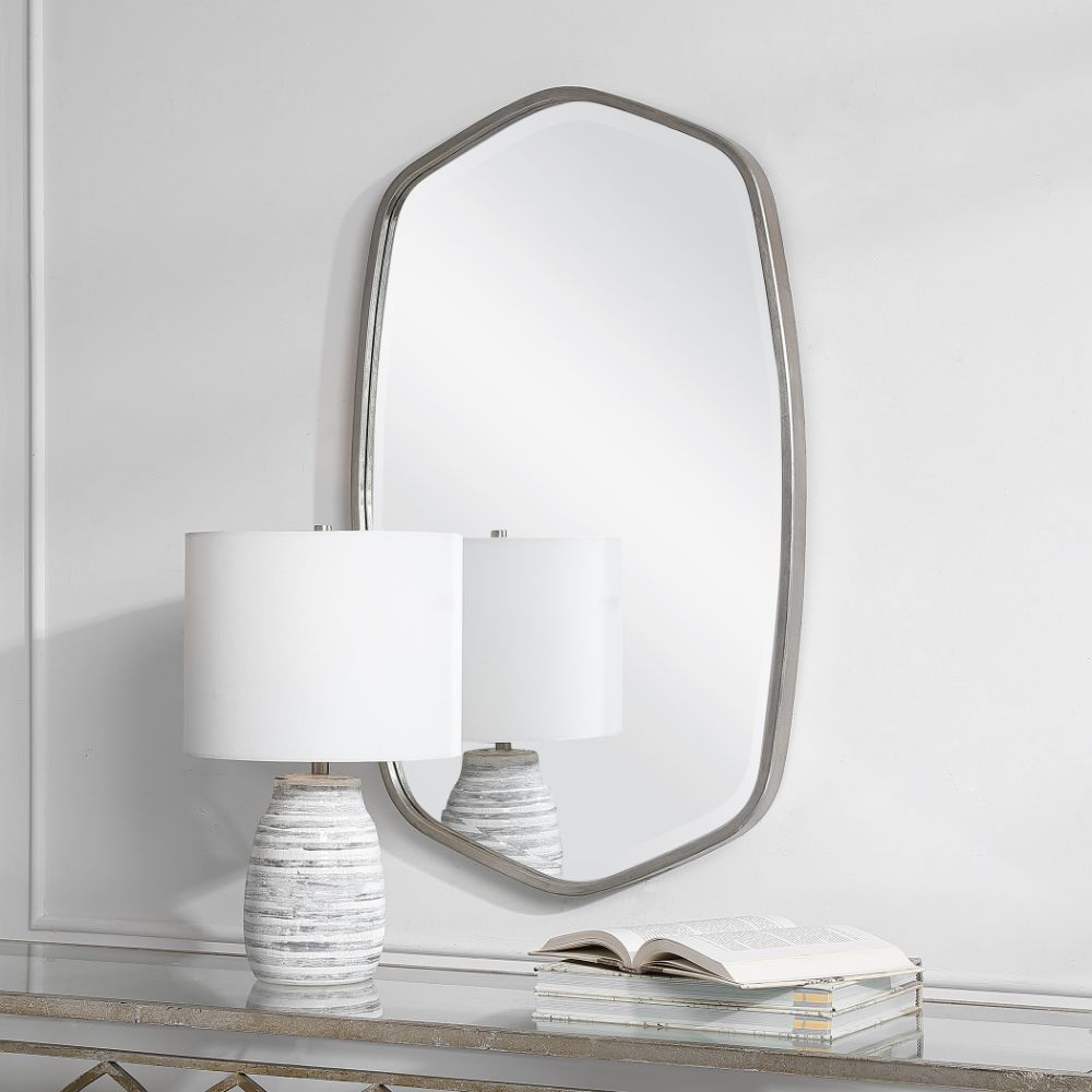 This Hand Forged Iron Mirror Frame Features A Unique Shape with Elegant Curves, Finished in A Versatile Silver Leaf. Mirror Has A Generous 1 1/4" Bevel.
