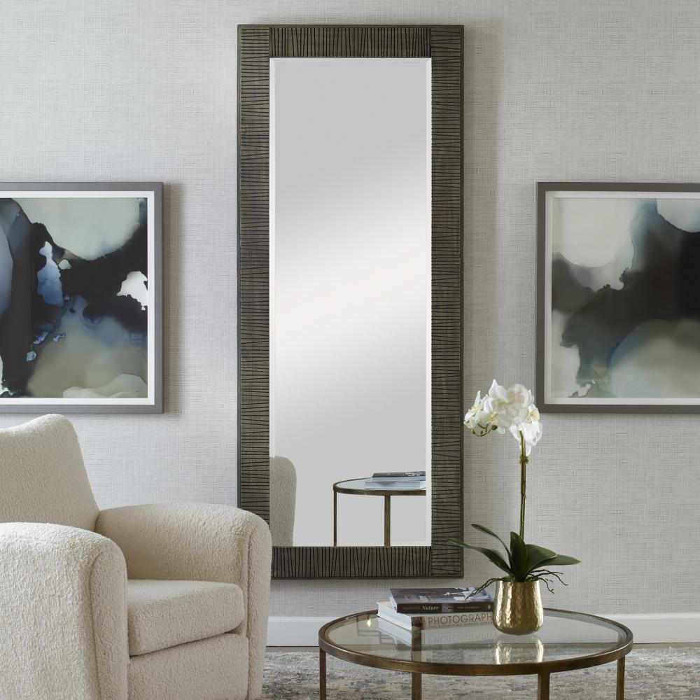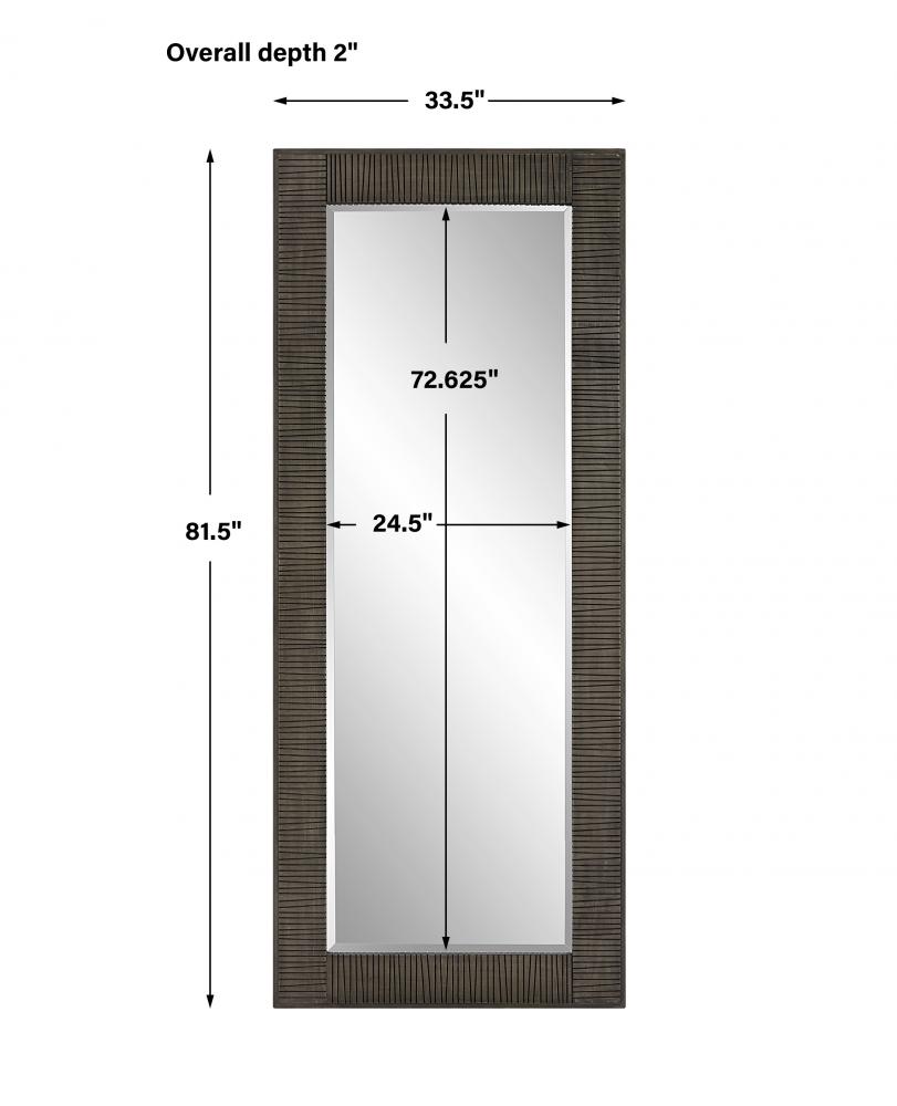 This Oversized Mirror Features A Solid Wood Frame with Hand Carved Channels Finished in A Rustic Wood Tone with An Aged Gray Wash. Mirror Has A Generous 1 1/4" Bevel and May Be Hung Horizontal or Vertical.