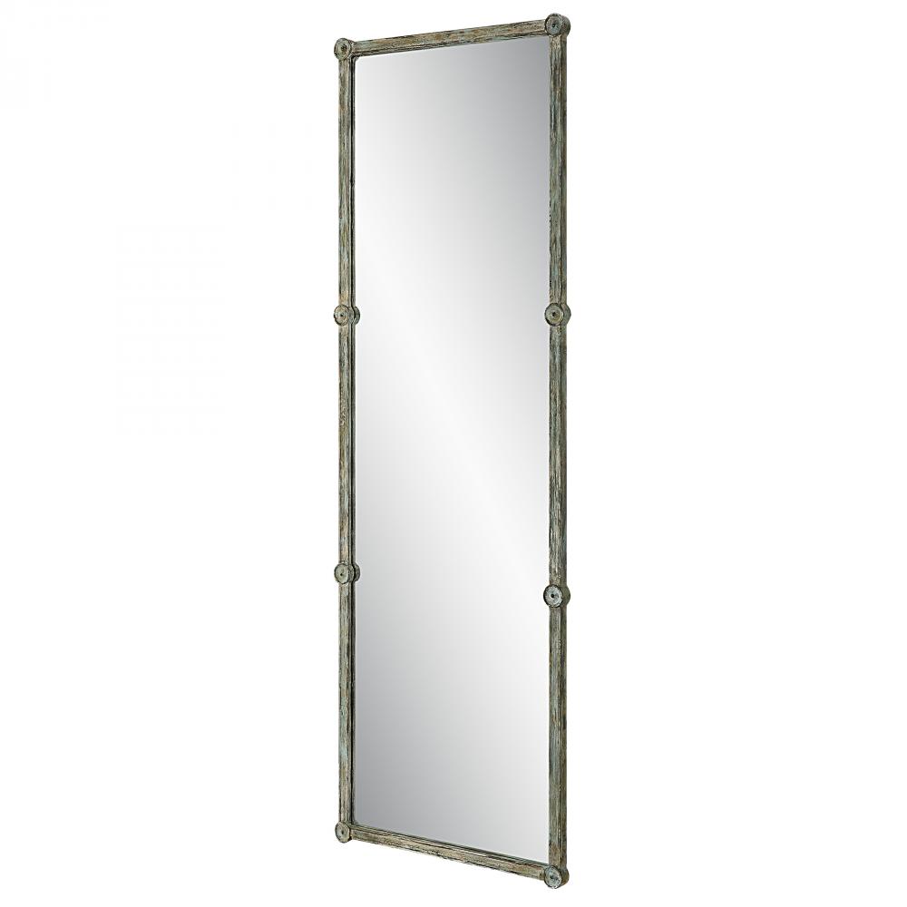 This Dressing Mirror Showcases A Traditional Design with Channeled Frame and Medallion Accents Featuring A Patinaed Finish of Weathered Verdigris Green with Rustic Black Undertones, Antique Distressing and A Light Gray Wash.