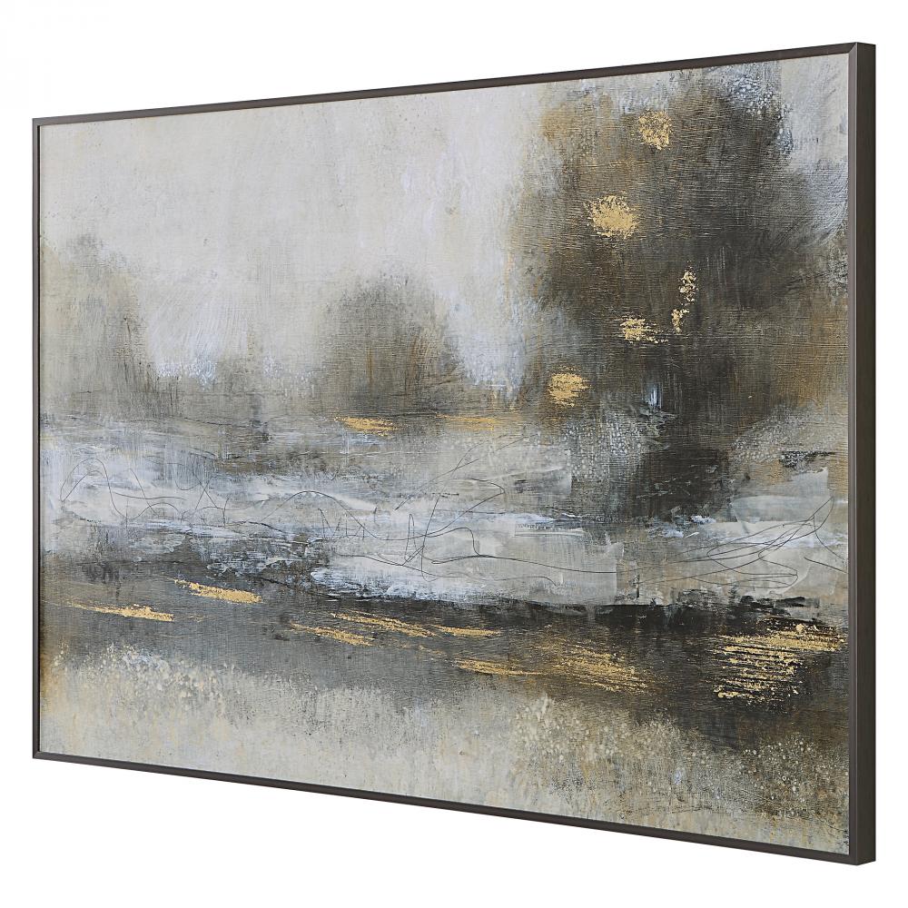 An Updated Version of A Classic Subject, This Framed Print Displays A Misty Landscape in Moody Neutral Tones with Hand Embellished Gold Leaf Accents That Bring Added Life and Dimension to The Artwork. A Petite Metal Frame in Brushed Gold Completes The Piece. Artwork By Tim O'Toole.