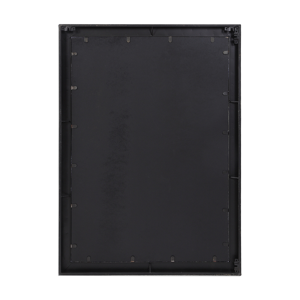 Crafted From Hand Forged Iron, This Rectangular Mirror Features Raised Geometric Detailing Finished in A Rustic Aged Black with Subtle Silver Highlights and A Gray Patina Wash. The Mirror is Surrounded By A Generous 1 1/4" Bevel and May Be Hung Horizontal or Vertical.