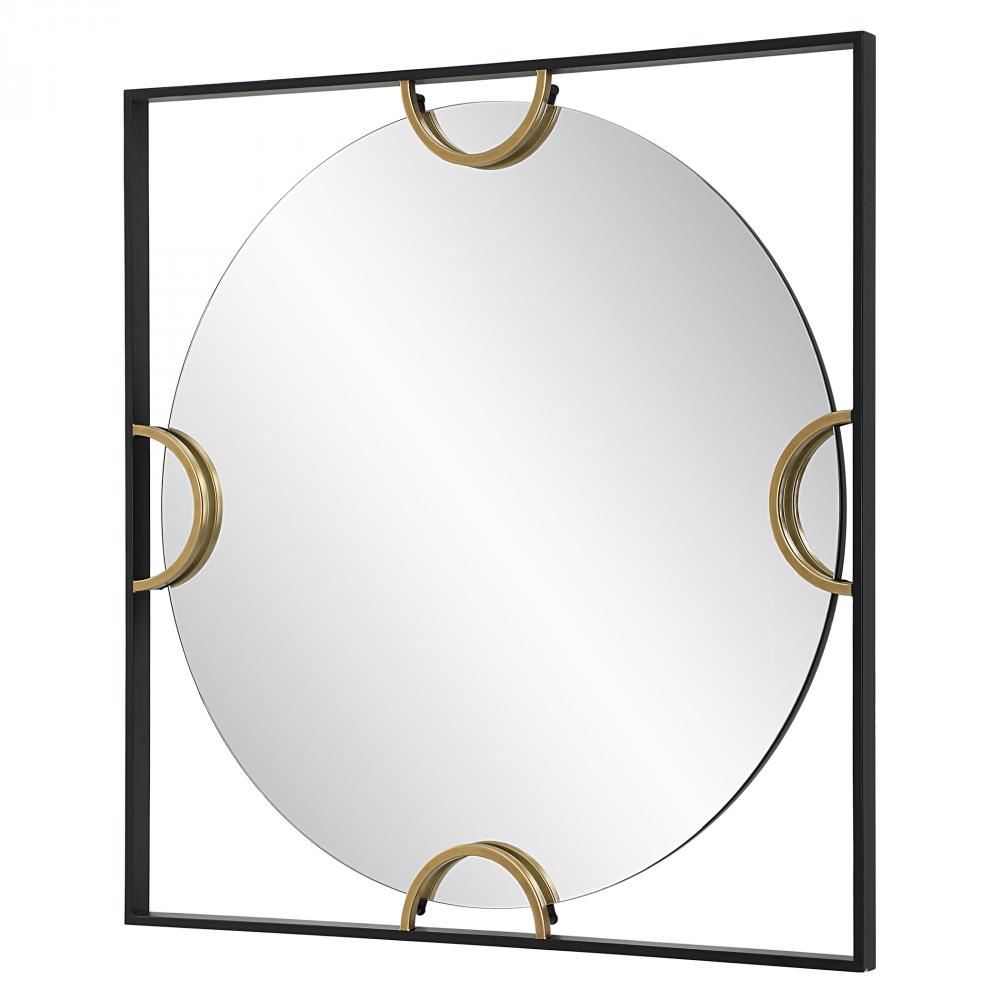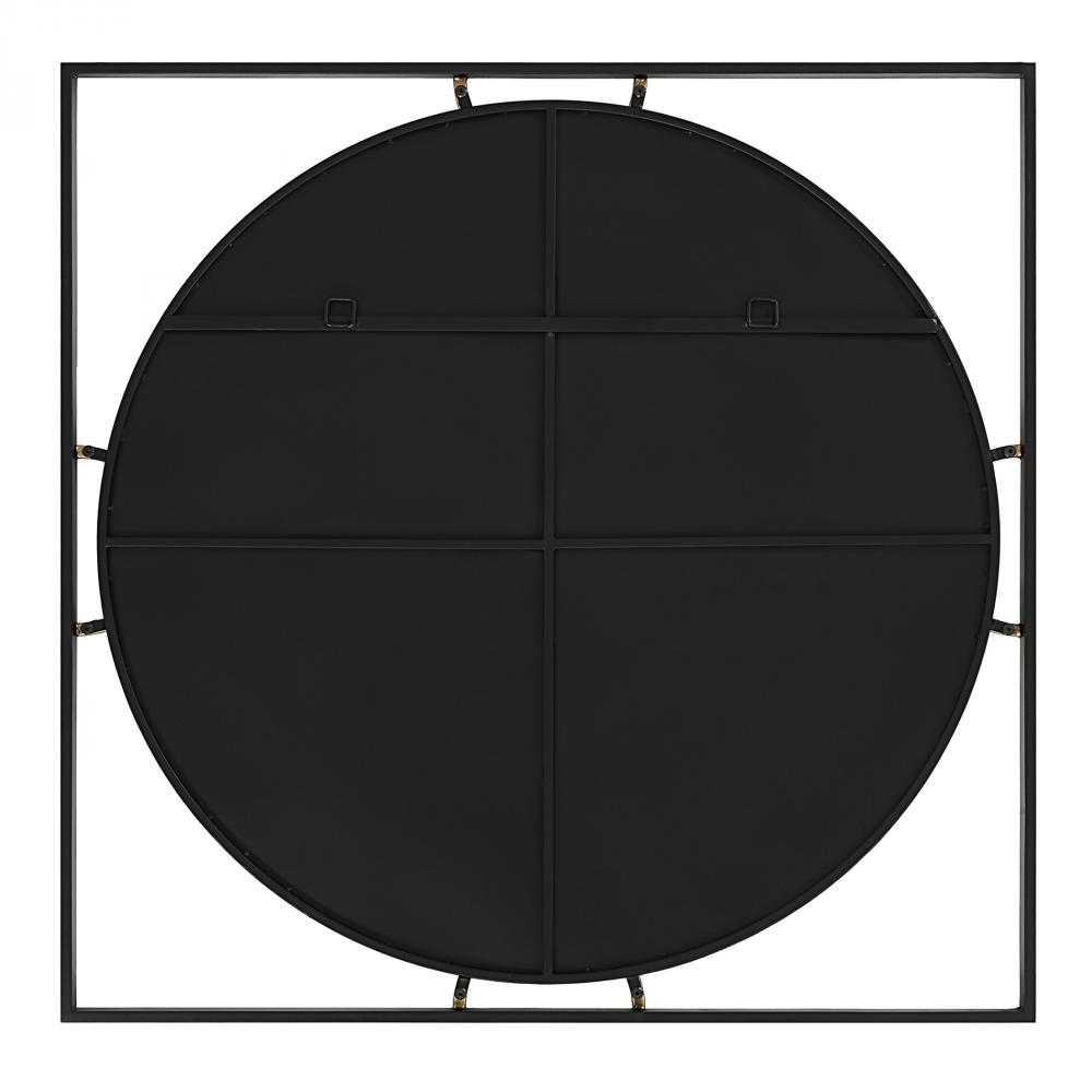 A Square Iron Frame Finished in Satin Black Surrounds A Suspended, Round Polished Edged Mirror, Held with Antique Gold Half Round Iron Bands.