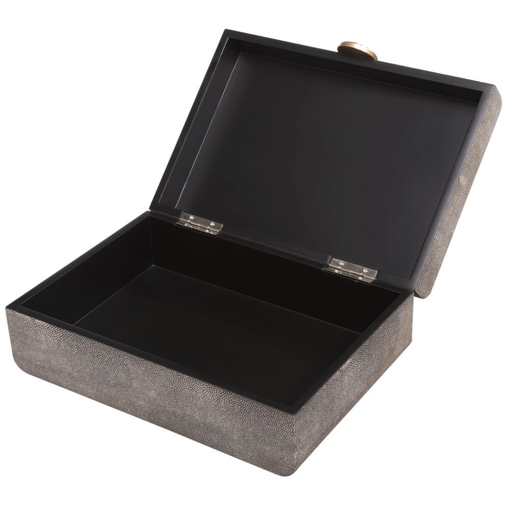 Inspired By The Art Deco Era, This Decorative Box Showcases A Faux Smoke Gray Shagreen Wrapped Exterior Accented By A Brushed Antique Brass and Black Enamel Closure. The Interior is Finished in Matte Black.
