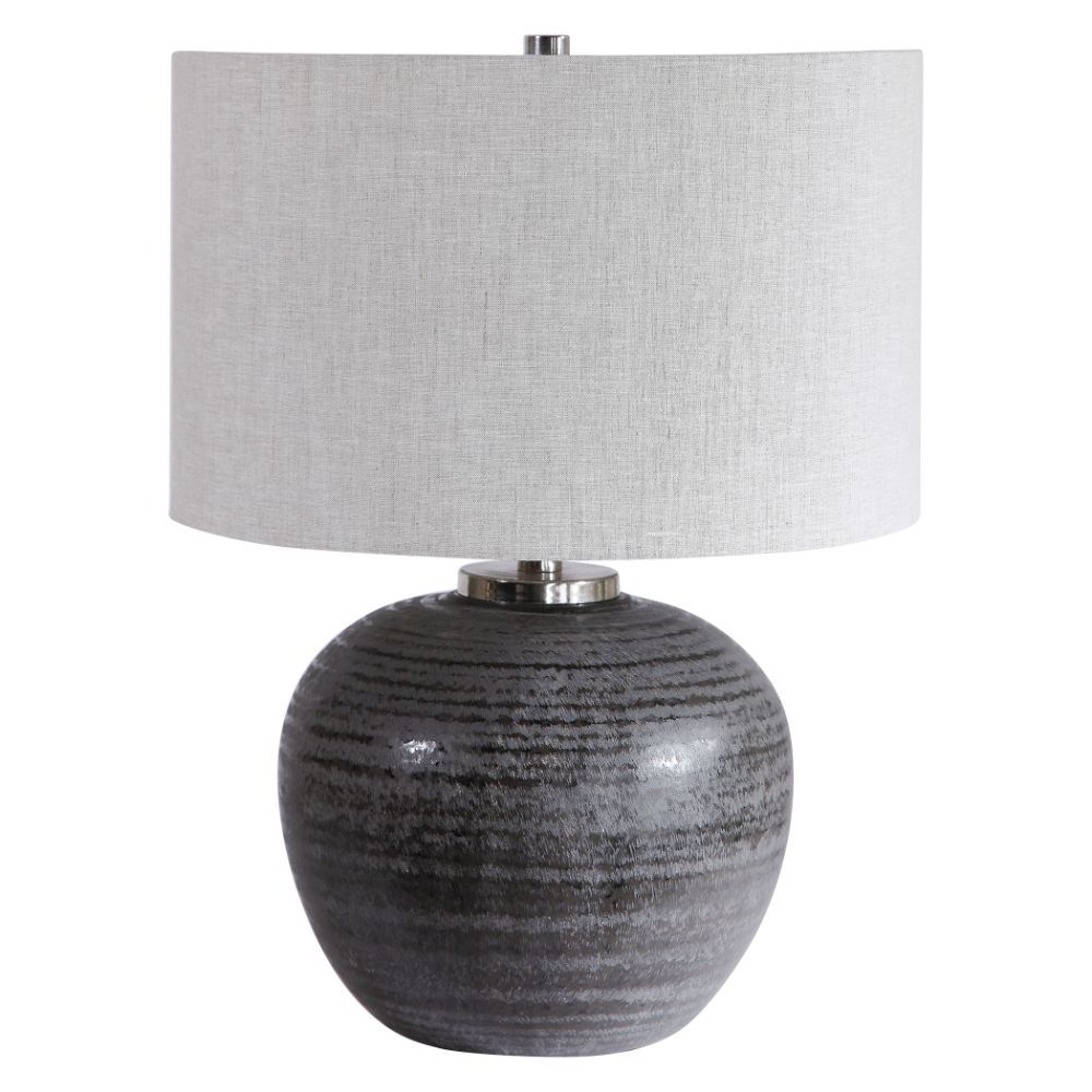 Finished in A Charcoal Glaze with Etched Texture, This Table Lamp Adds A Casual Yet Contemporary Feel to A Space. The Round Ceramic Base is Complemented By Brushed Nickel Hardware. A Round Hardback Drum Shade in Oatmeal Linen Completes The Piece.