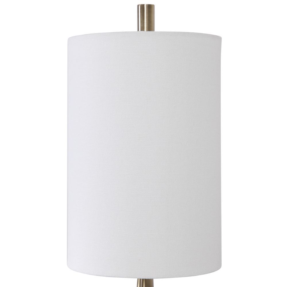 Transitional in Design, This Buffet Lamp Has A Tapered Base Finished in A Plated Antique Brass, Accented with A Polished White Marble Detail. This Piece Has A White Linen Hardback Drum Shade.