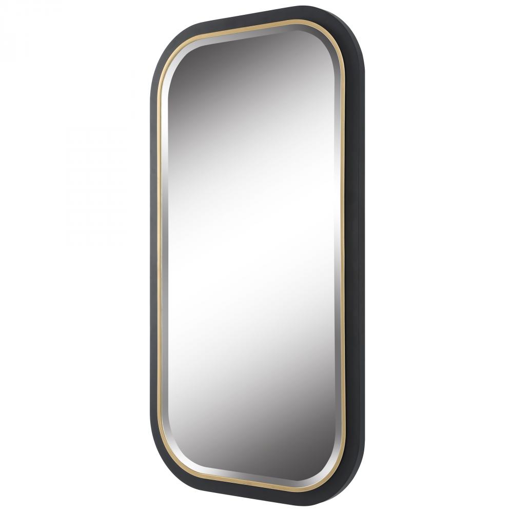 The Nevaeh Mirror Displays An Elegant Curved Profile with A Satin Black Finish, Accented with A Petite Gold Leaf Inner Edge. Mirror Features A Generous 1 1/4" Bevel. May Be Hung Horizontal or Vertical.