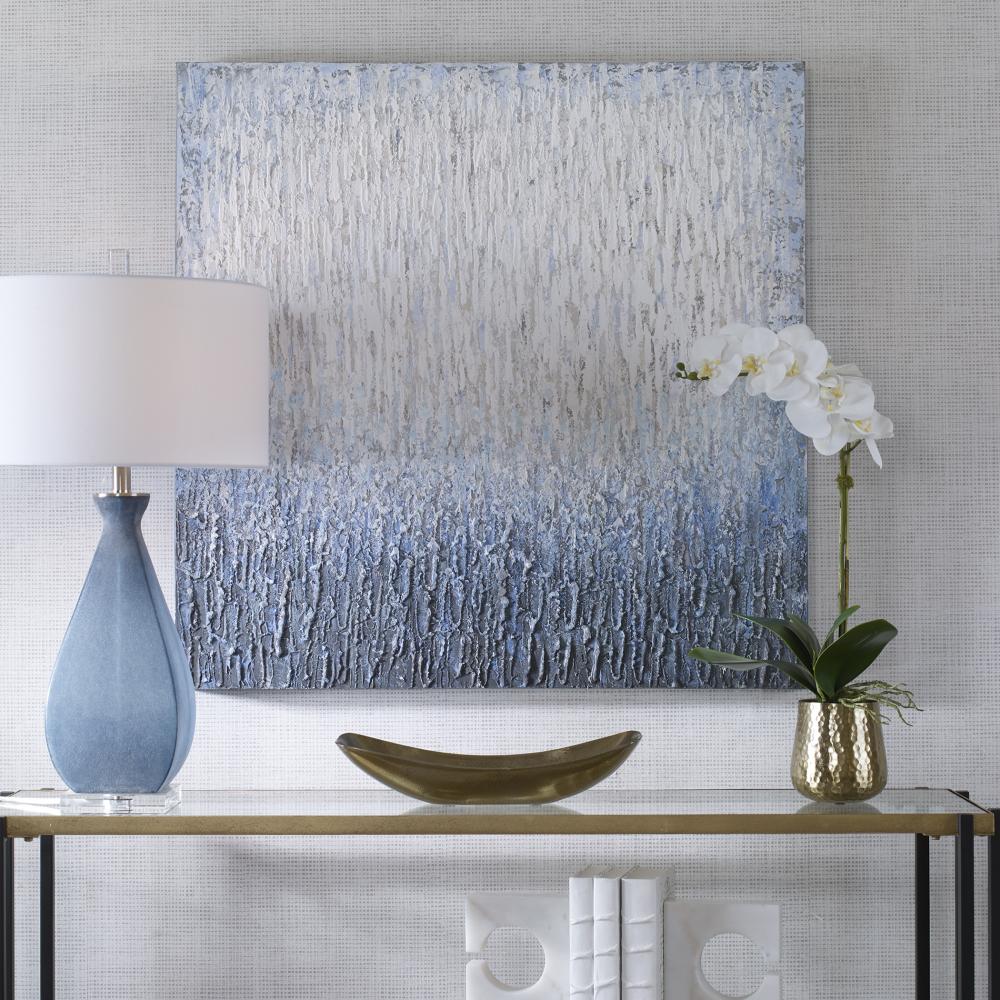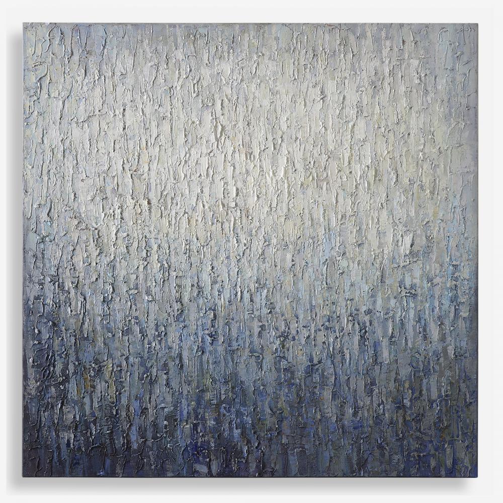 Contemporary Style Emanates From This Hand Painted Abstract Artwork on Canvas. This Piece Features Lush Texture Detailing in Rich, on Trend Blue Tones. The Monochromatic Tones Slowly Fade From Light Gray-blue to Deep Navy, Evoking A Coastal Feel. Each Canvas is Stretched and Attached to A Wooden Frame. Due to The Handcrafted Nature of This Artwork, Each Piece May Have Subtle Differences.