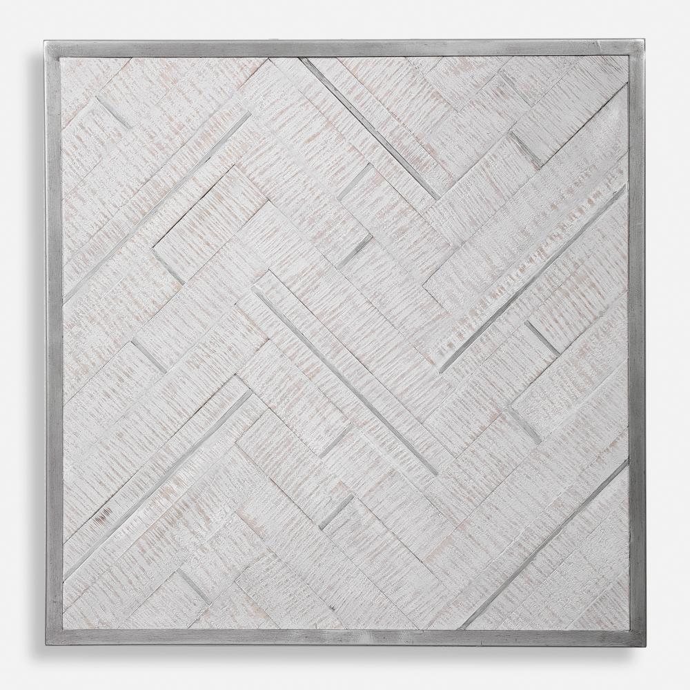 This Wood Wall Panel Personifies Modern Coastal Style with Whitewashed Pine Wood in A Classic Herringbone Pattern Accented By Sleek Silver Bar Inserts. Each Piece is Paired with A Distressed Brushed Silver Frame and May Be Hung Horizontal or Vertical.