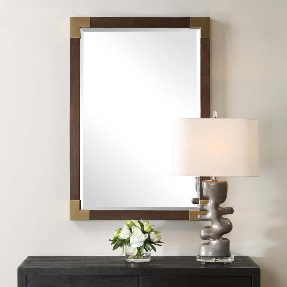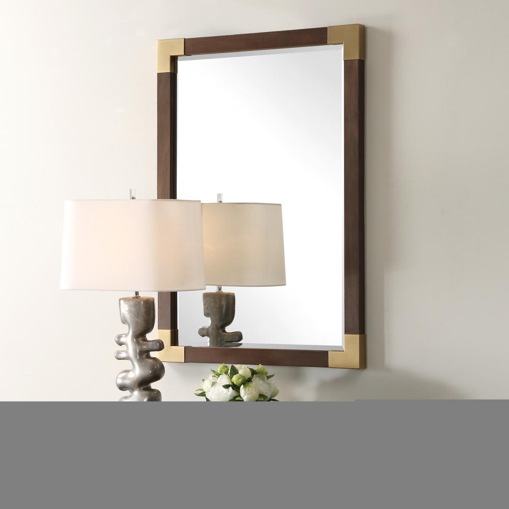 Embrace Timeless Elegance With Our Solid Wood-framed Mirror, Finished In An Aged Walnut Veneer. Each Corner Is Adorned With Delicately Antiqued Gold Iron Caps, Adding A Touch Of Refinement And Sophistication To Any Room. Mirror Has A Generous 1 1/4" Bevel. May Be Hung Horizontal Or Vertical.