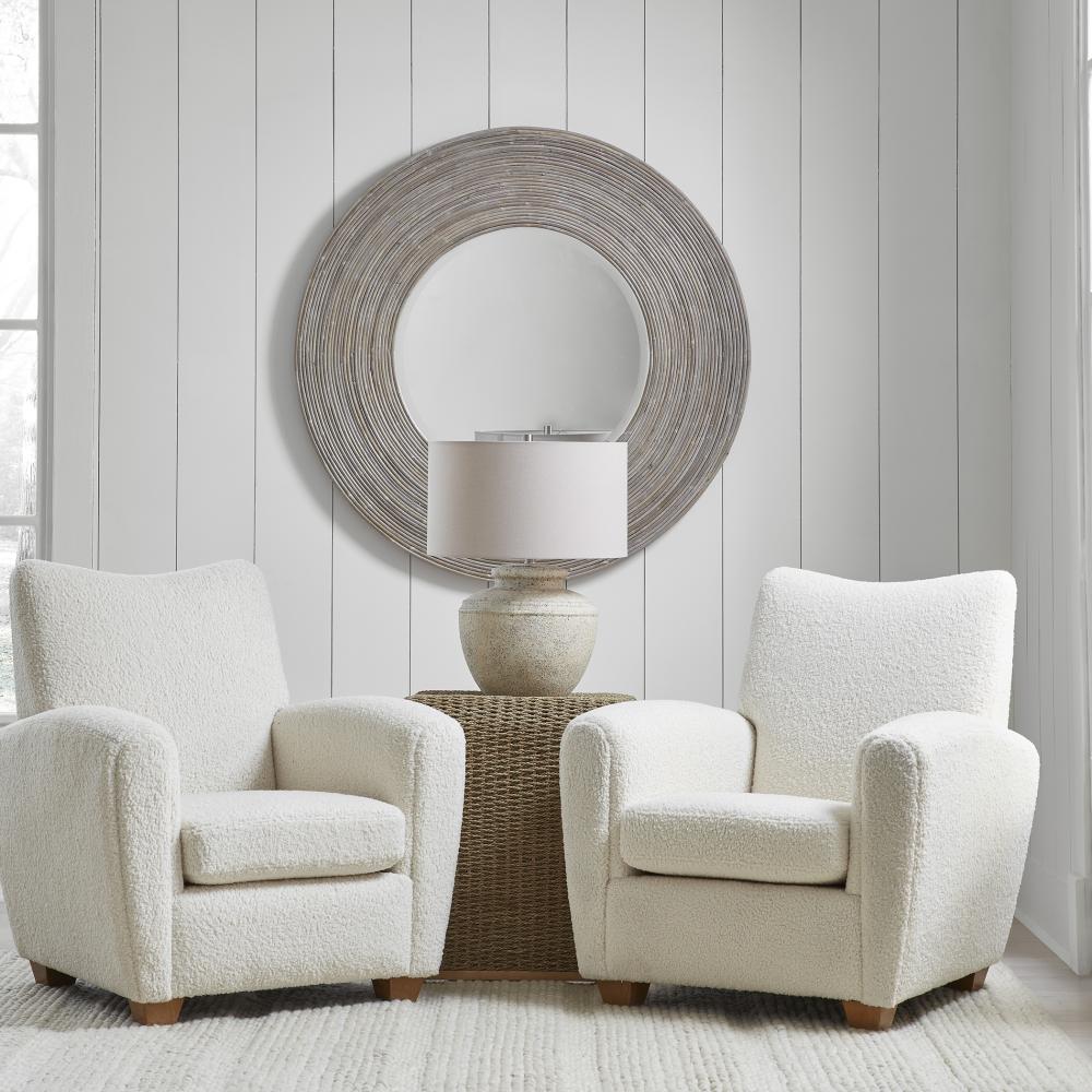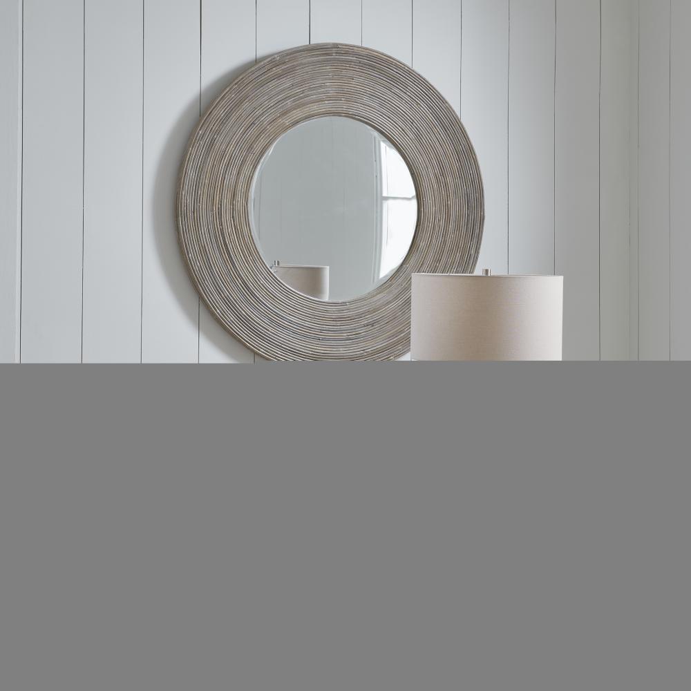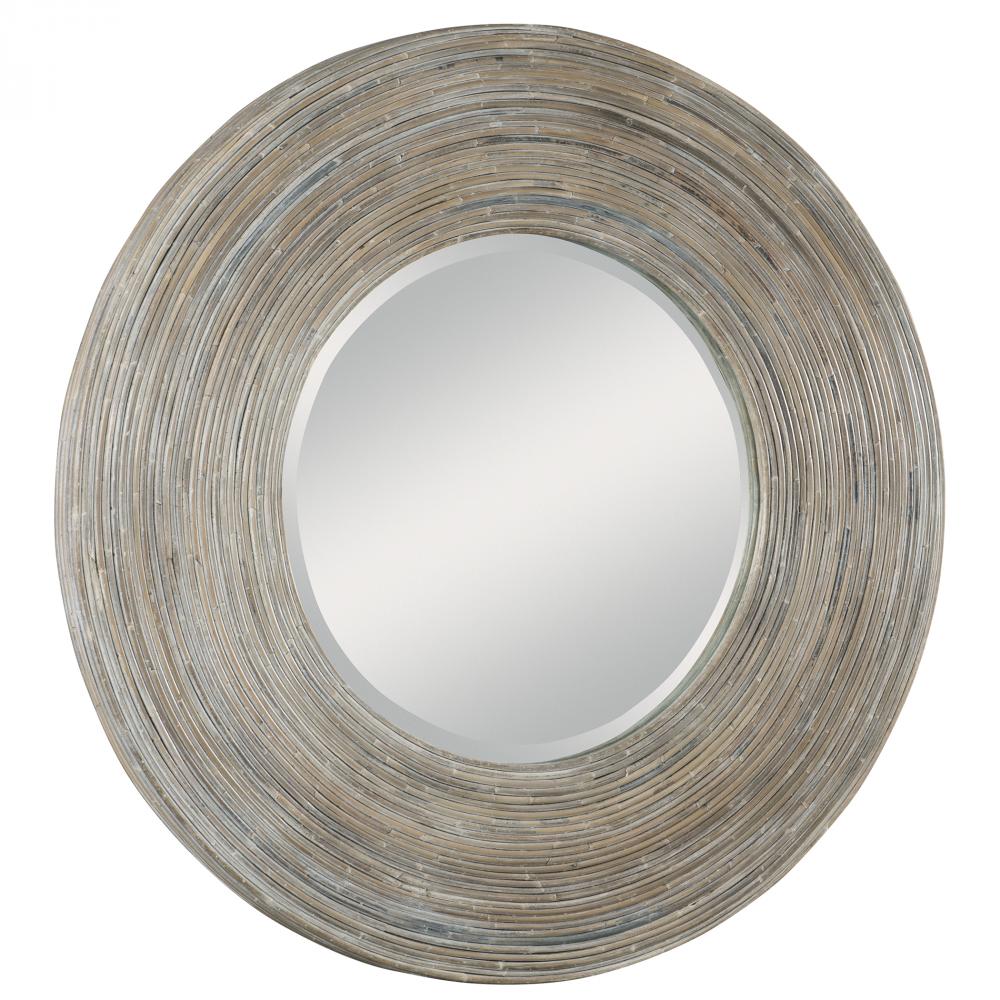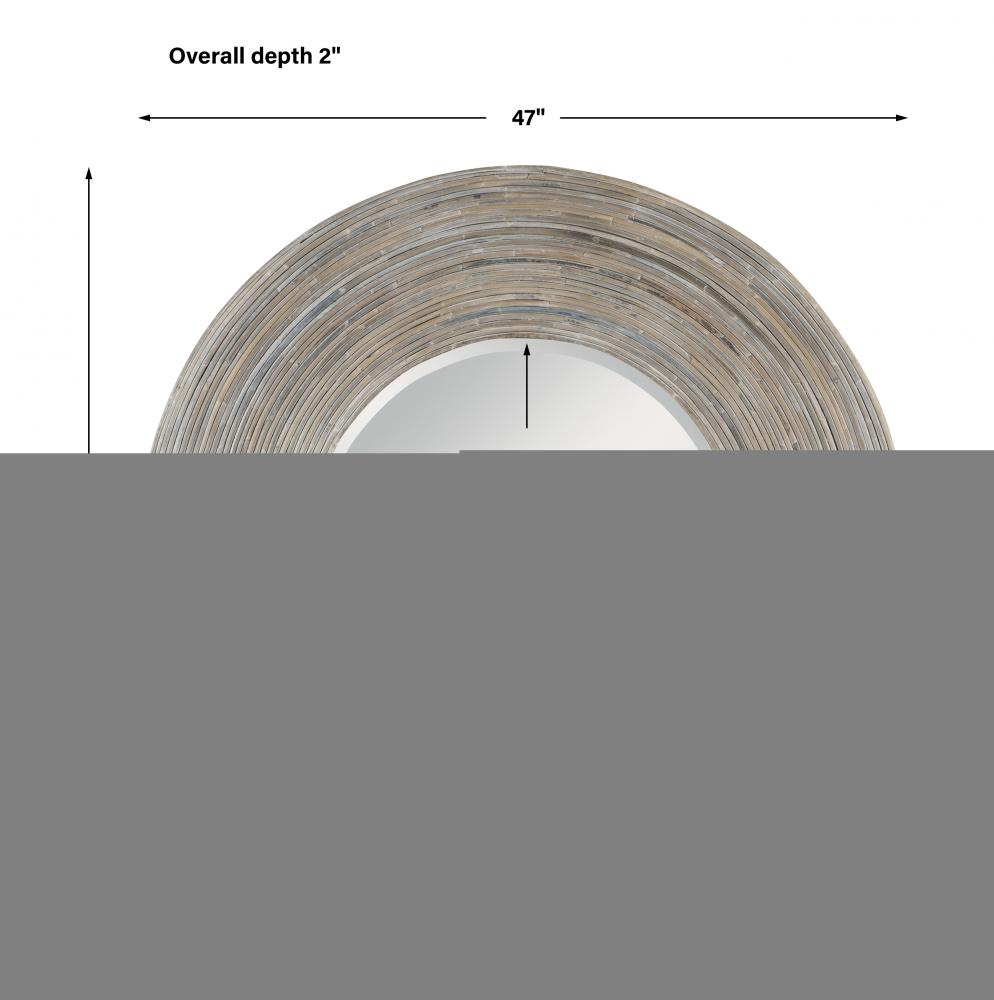 The Vortex Round is Crafted From Layered Rings of Natural Rattan with A Hand Rubbed, Casual White Washed Finish. Mirror Features A Generous 1 1/4" Bevel.