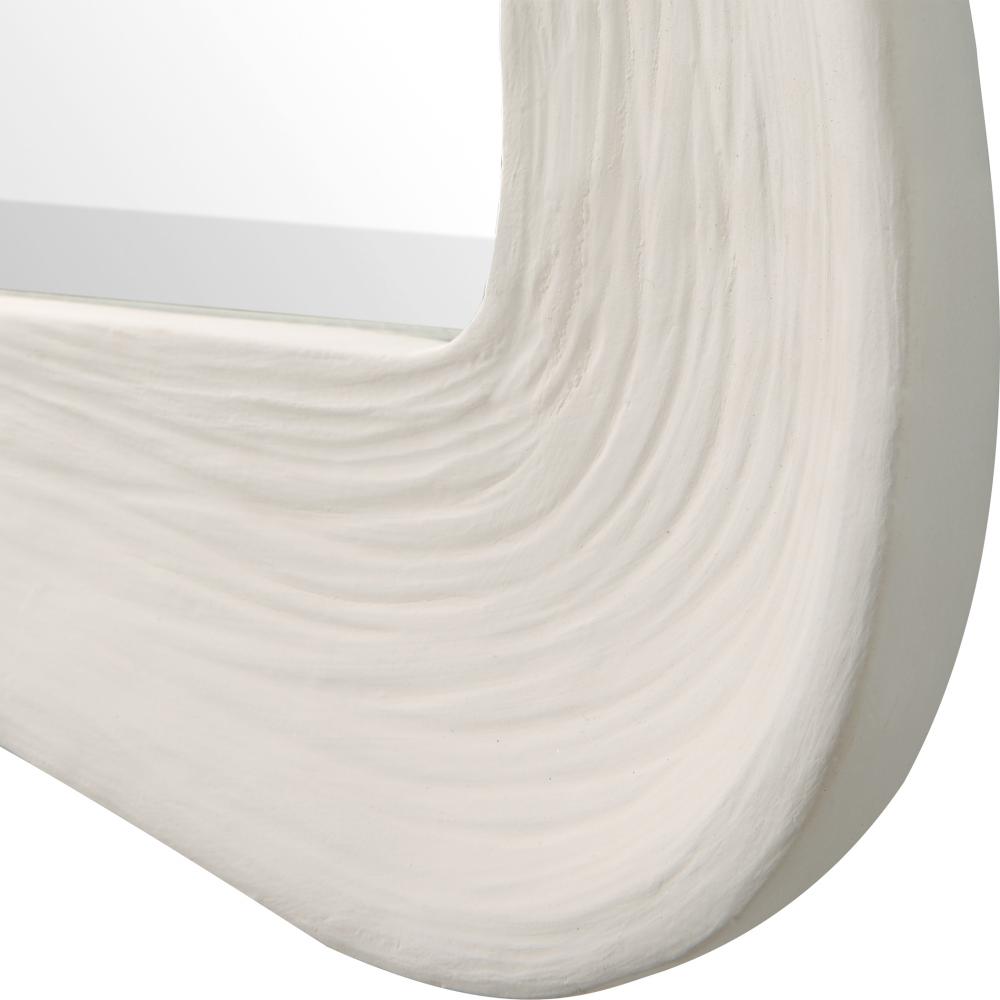 This Mirror Showcases A Contemporary Coastal Design with A Wavy Organic Shaped Frame Finished in Matte White with Noticeable Waves and Texture. Mirror Has A Generous 1 1/4” Bevel. May Be Hung Horizontal or Vertical.