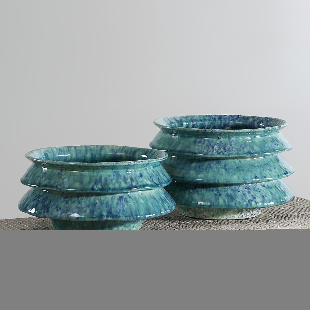 Introducing Our Stunning Set Of Two, Accordion Style Ceramic Bowls, With A Harmonious Blend Of Nature's Hues. Crafted With Care And Adorned In A Captivating Blue And Green Reactive Glaze. Sizes: S- 10x5x10, L- 10x7x10