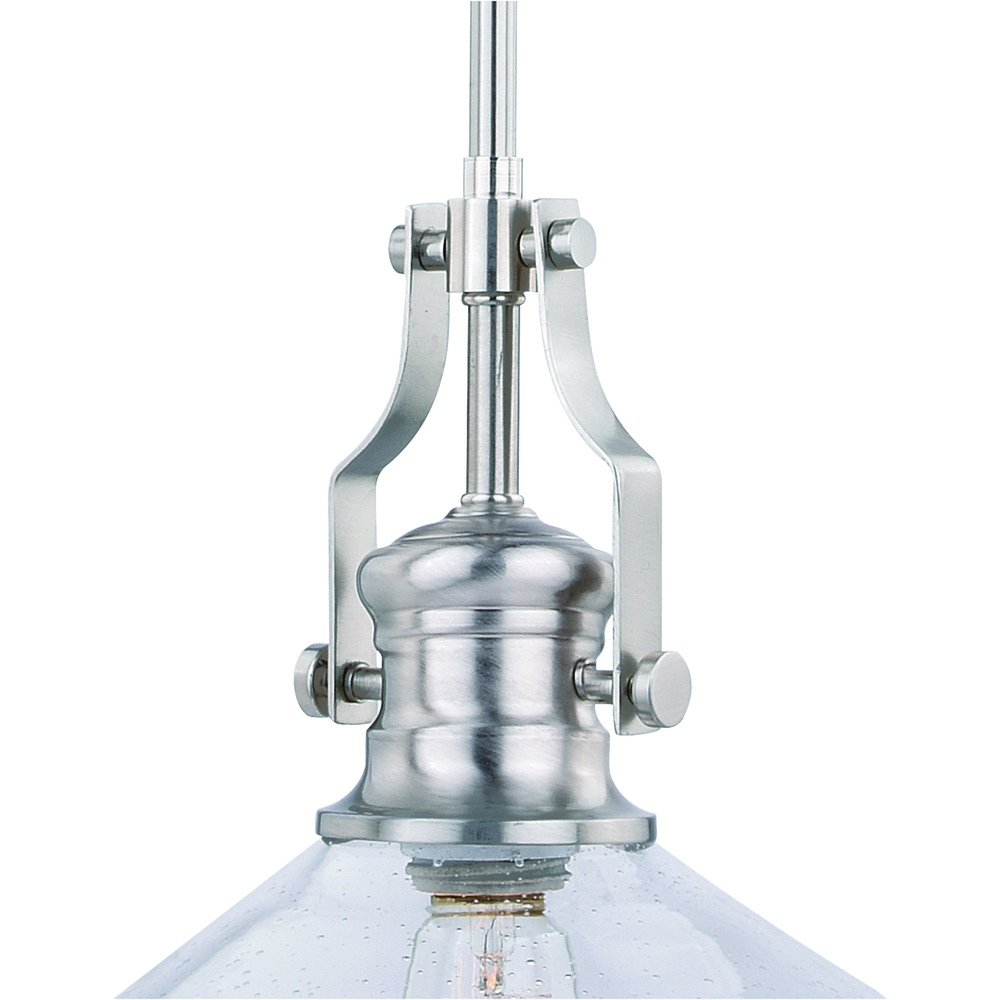 The Beloit collection a welcoming and inviting feel to your kitchen or living spaces. Soft curving lines finished in satin nickel, are paired with large clear seeded glass shades, creating a look accents the most comfortable spaces.