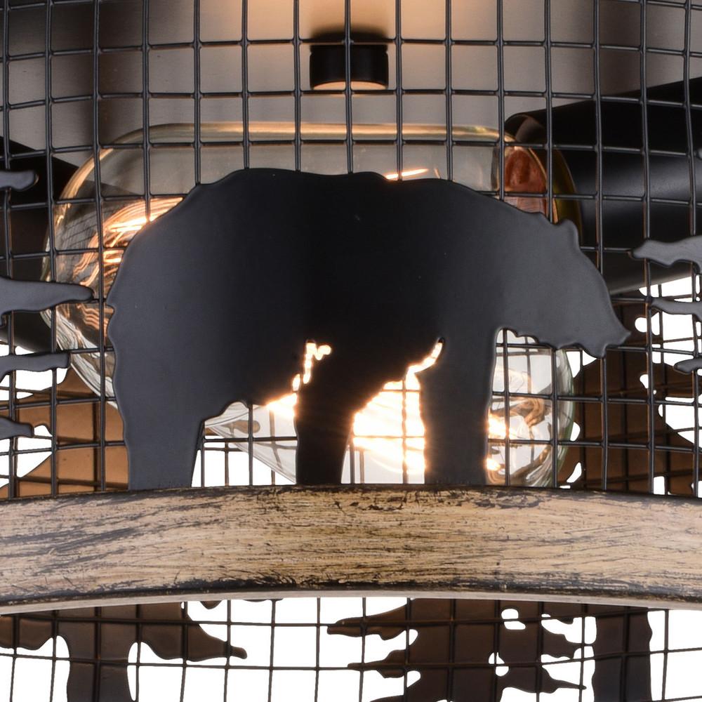 Get wild with this drum style ceiling light called Kodiak. The pairing of the black and burnished teak finish enhances the on-trend metal cage perfectly. Capture your love of nature with pine tree and bear silhouettes. It is an excellent choice for a vacation lodge, cabin or suburban home and complements a variety of home styles: anywhere you want to bring an element of nature. Rated for damp locations, it can be used in any bathroom, family room, or any other area of your home.
