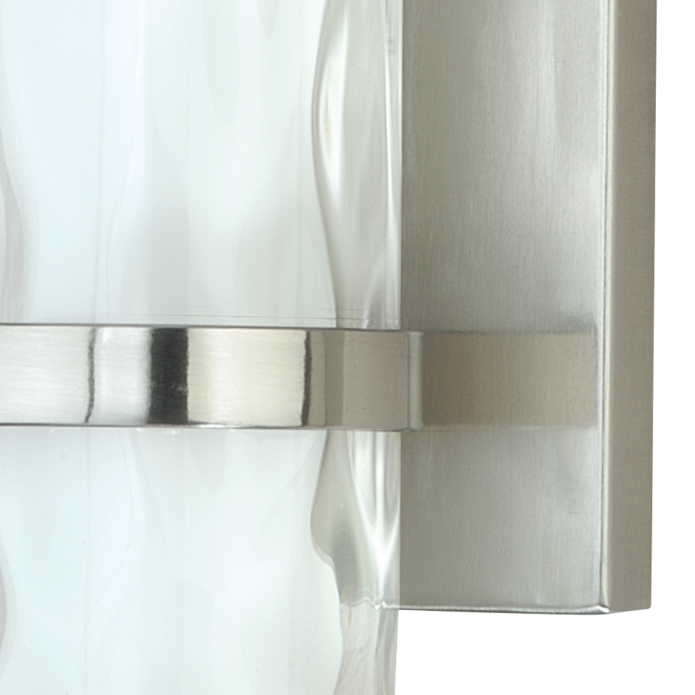 This contemporary 1-light wall sconce would be an attractive addition to any bathroom. Its satin nickel finish, outer water glass, and inner frosted opal glass shows wonderful dimension.