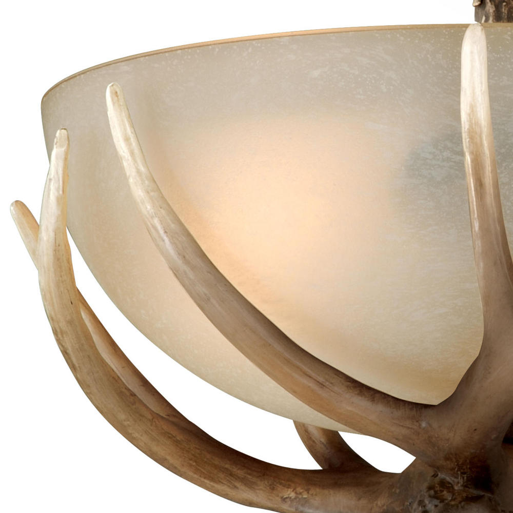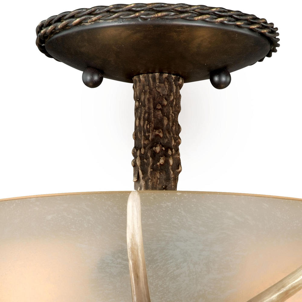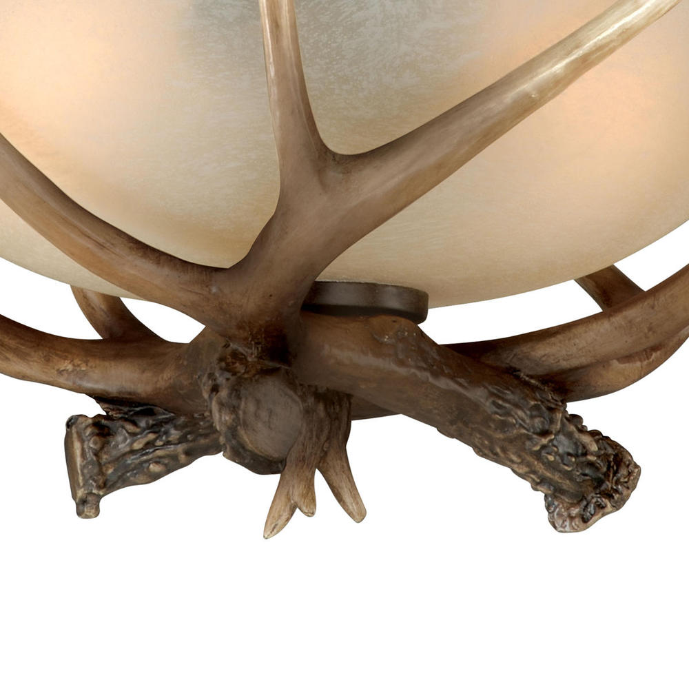 Evoking the spirit of the wilderness, this rustic themed light is clad in a black walnut finish and features crème cognac glass. It will complement a variety of home styles bringing an element of nature indoors. The Yoho collection features reproduction deer antlers making it a great choice for a vacation lodge, cabin or suburban homes. This semi flush mount ceiling light is ideal for hallways, living rooms, bedrooms, entryways or utility rooms.