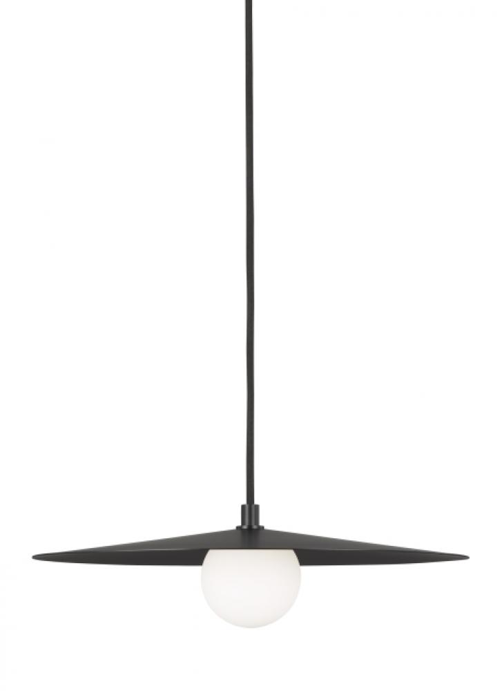 The Pirlo pendant by Sean Lavin for Visual Comfort Modern contrasts a flattened metal shade with a frosted glass globe, creating the quintessential Mid-Century modern look. The metal shade directs light downward for illuminating surfaces. The shade is scaled at 22" diameter, making this pendant a sharp design piece for your living room, dining room, kitchen, and foyer. Offered in modern finishes, with and without lamp. Lamping options are compatible with most dimmers. Refer to the Dimming Chart for more information.