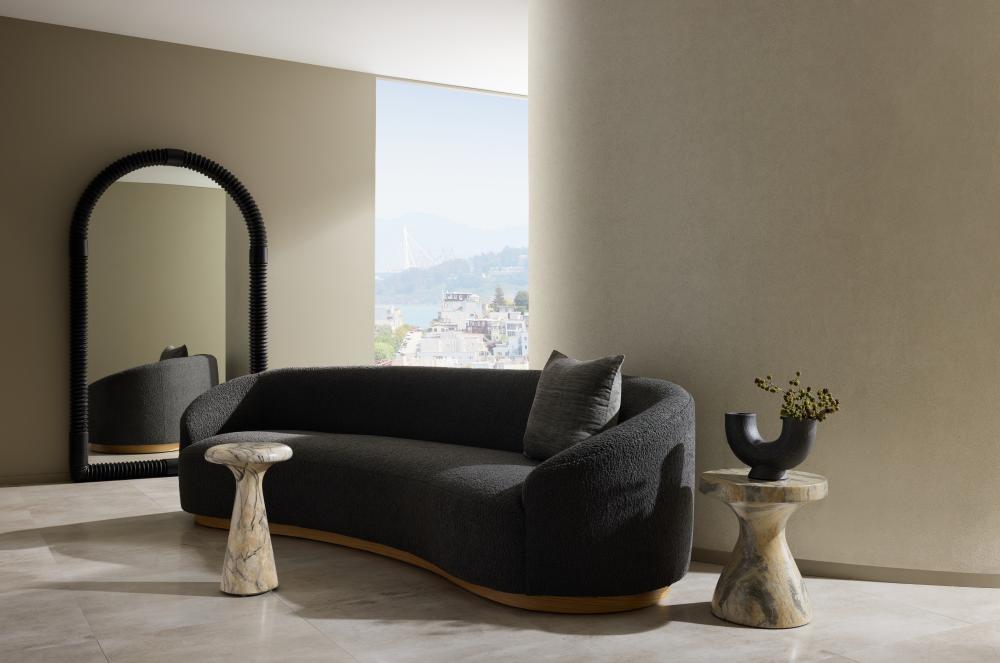 The playful, uninhibited lines of the Italian Memphis furniture movement inform a carved arch mirror. Crafted of mango wood with an ebony finish, its substantial lines are accented with arched breaks. Designed to be hung vertically or placed on the floor, this impactful style it is stabilized with a security cleat. Finish will vary.